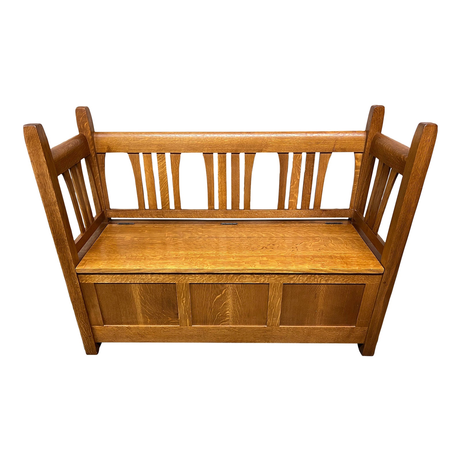 Stickley Model no 89/91-115, in solid oak From the company catalog: “A perfect hallway piece, this Gus Storage Settle with its Gothic arched back and frame and panel base contains a storage space concealed under the seat.”