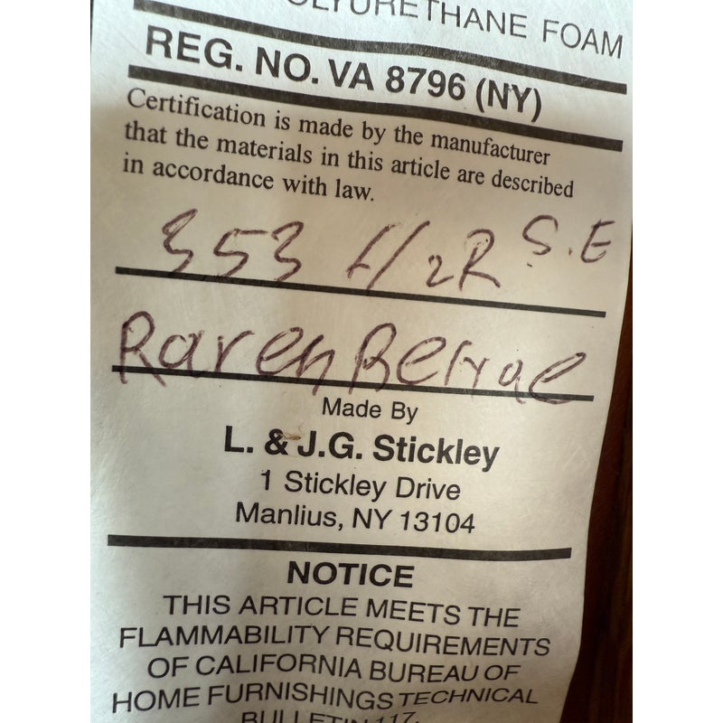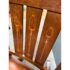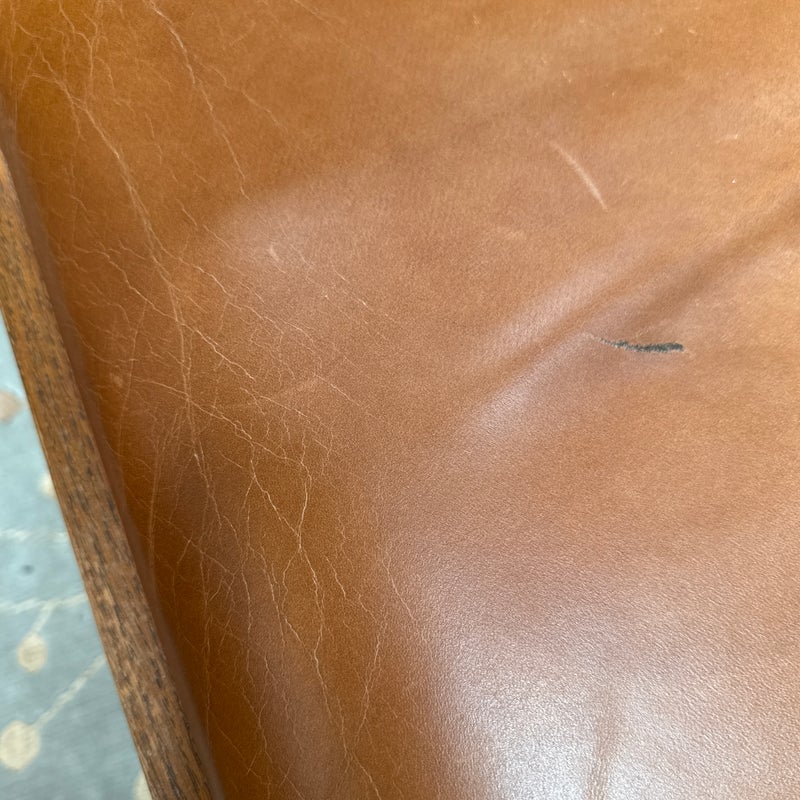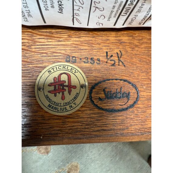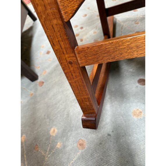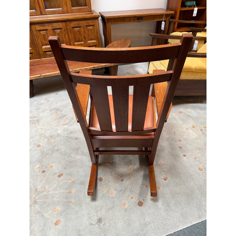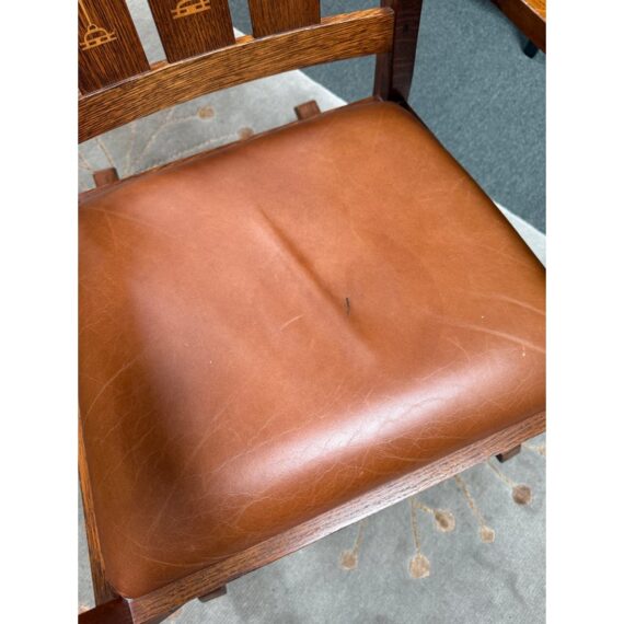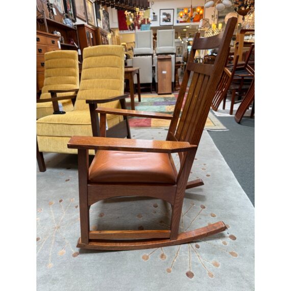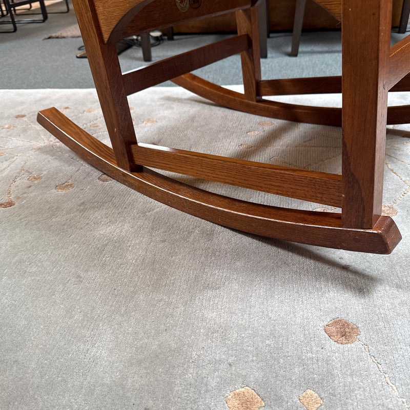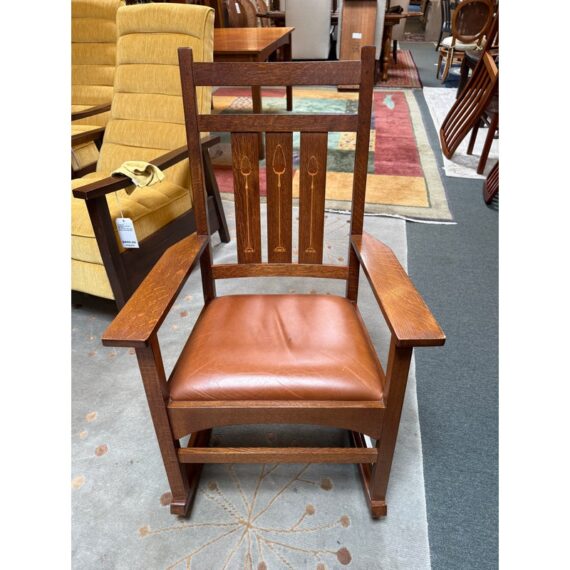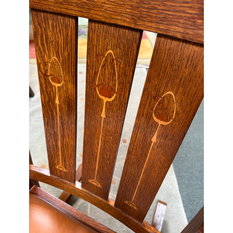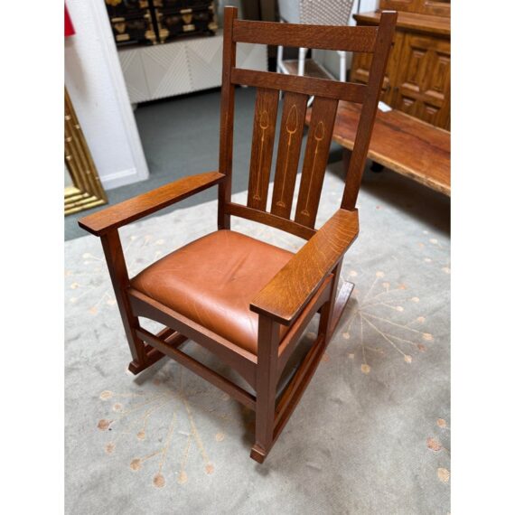 Design Plus Gallery presents a Harvey Ellis Collection Rocking Chair from Stickley Furniture. This gorgeous rocking chair references both Mission or Arts & Crafts styles. With airy slats, arcing aprons, and narrow lines, the oak silhouette remains light. Delicate milkweed-inspired inlay forms a delicate floral motif that is a tribute to the design work of Harvey Ellis. Cushioned caramel leather seat adds comfort. Light surface wear(shown) on leather and frame; condition is good for age and use.