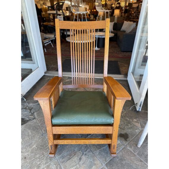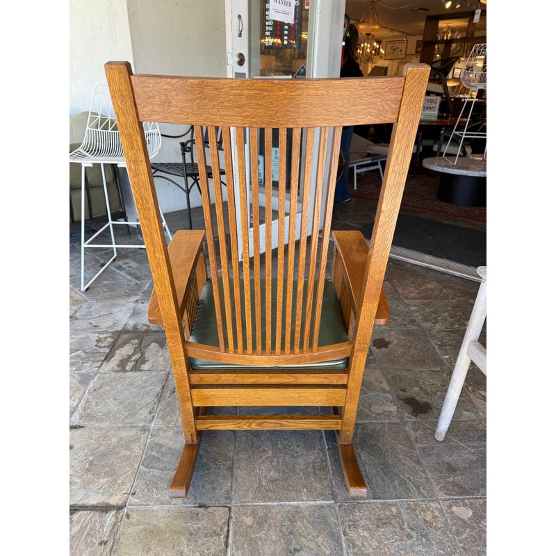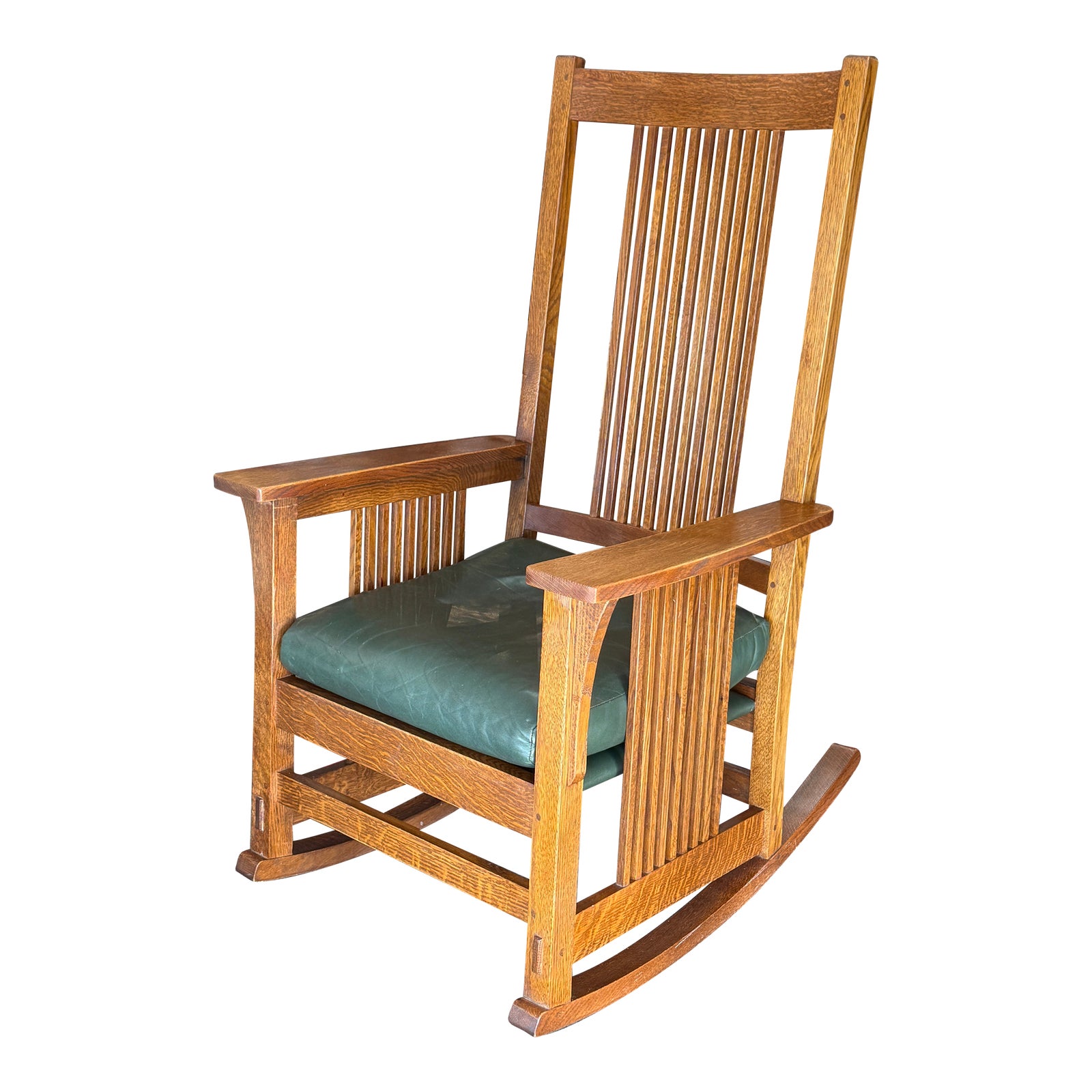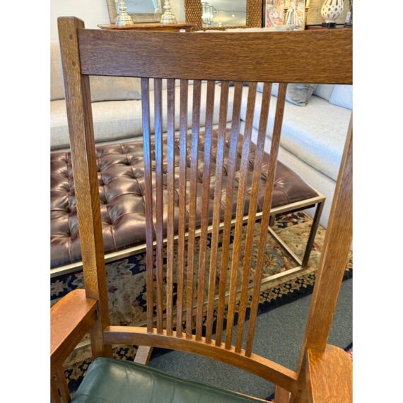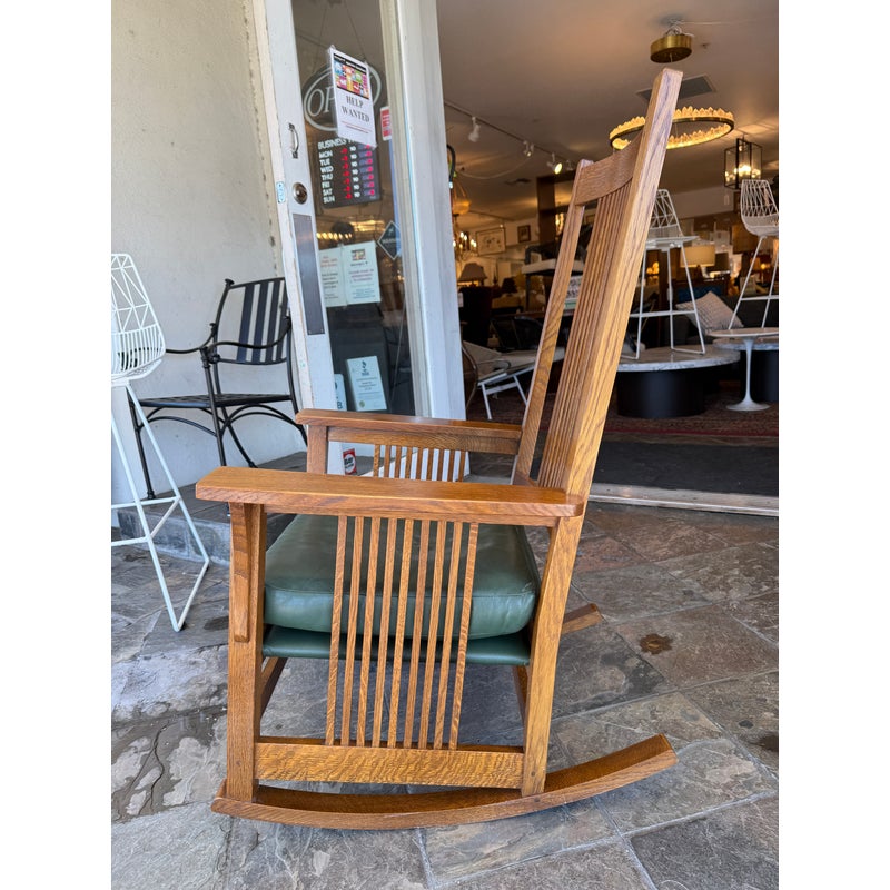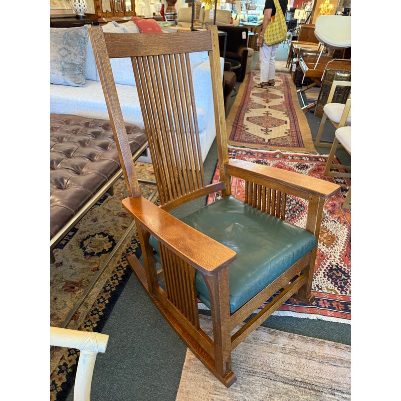 Design Plus Gallery presents a Mission Style Spindle Back Rocking Chair from Stickley Furniture. This rocking chair was designed by Gustav Stickley and is in solid oak wood with flat spindles adorning its back and sides of the frame. The comfortable removable seat is upholstered in cushioned green leather. The 376 Rocker is part of the original April 1989 reissued Mission Collection. Light surface wear; condition is good. Made in the United States of America.