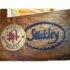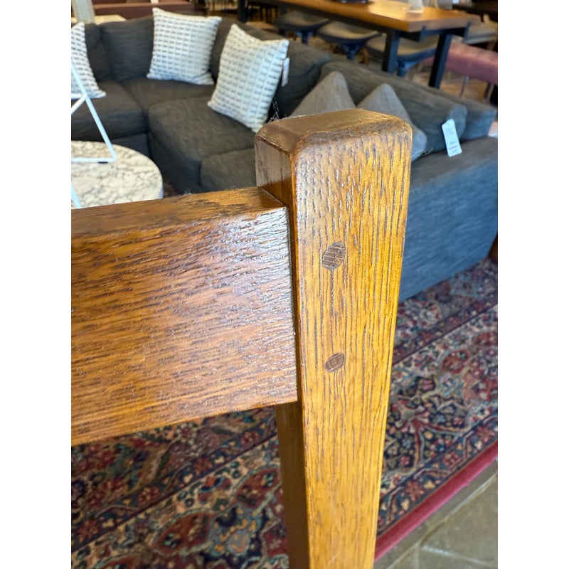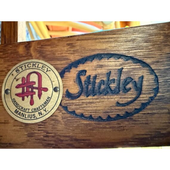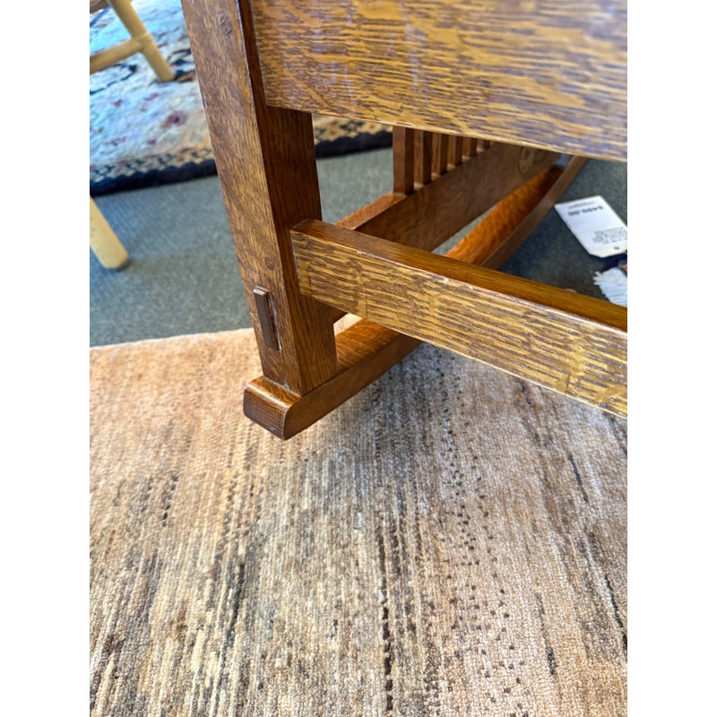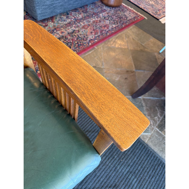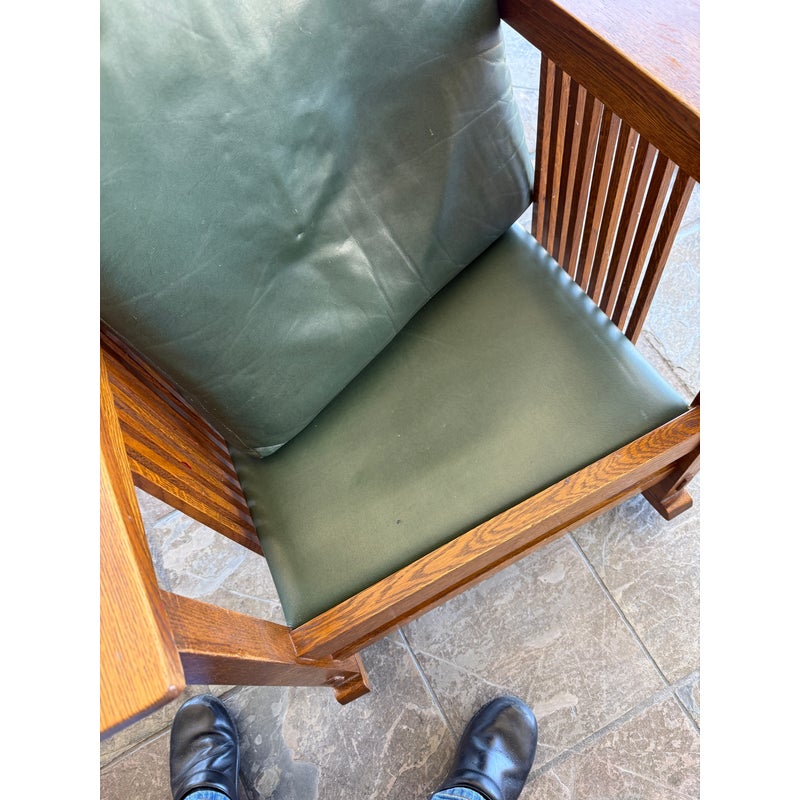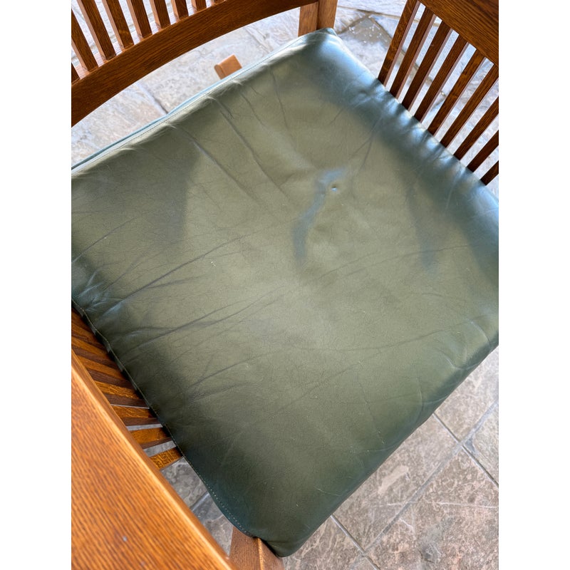 Design Plus Gallery presents a Mission Style Spindle Back Rocking Chair from Stickley Furniture. This rocking chair was designed by Gustav Stickley and is in solid oak wood with flat spindles adorning its back and sides of the frame. The comfortable removable seat is upholstered in cushioned green leather. The 376 Rocker is part of the original April 1989 reissued Mission Collection. Light surface wear; condition is good. Made in the United States of America.