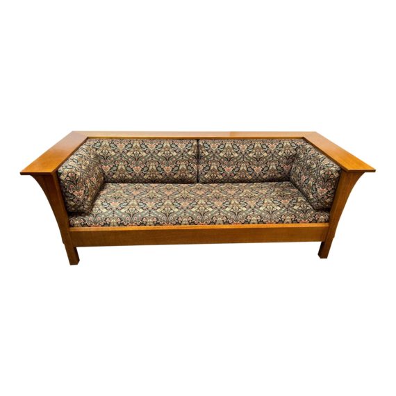Design Plus Gallery presents the Prairie Settle Sofa by Stickley. Based on an iconic 1910 L. & J. G. Stickley design, the Prairie Settle embodies Mission design. The deeply comfortable Prairie Settle is framed in solid oak that features dramatic book-matched panels along the sides and back, as well as elongated corbeled arches. This lovely piece is upholstered in a thick floral period fabric, back and side foam-filled pillows are removable. The settle includes one matching 15-inch decor pillow. Beautiful overall condition; cambric dust cover is torn.