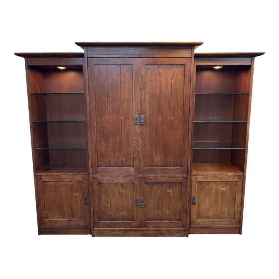 Design Plus Gallery presents the Stickley Mission Arts and Crafts Media Center. The middle piece includes three shelves and five drawers, two of which include separators. It also has a square board that can be removed for media purposes. Both side pieces include a lower cabinet and three adjustable glass shelves. Lights are built into the tops of the side pieces. Minor wear from use and age; set is in good condition.