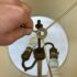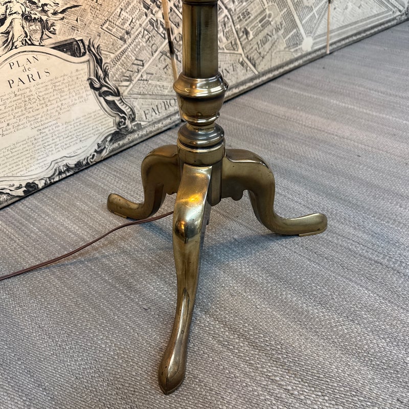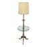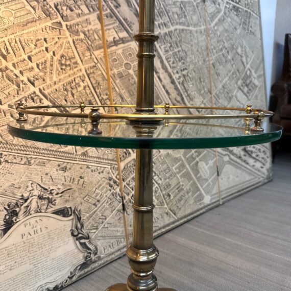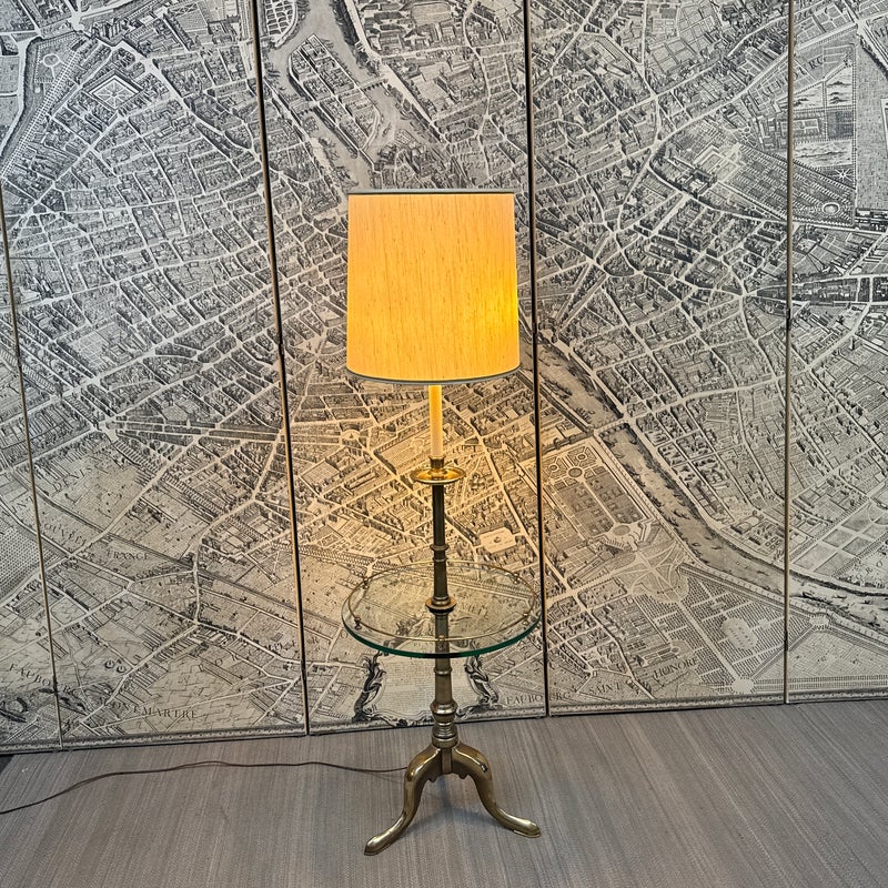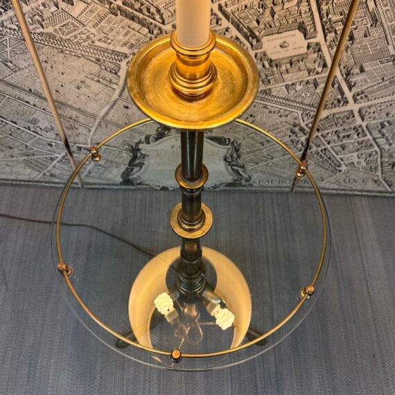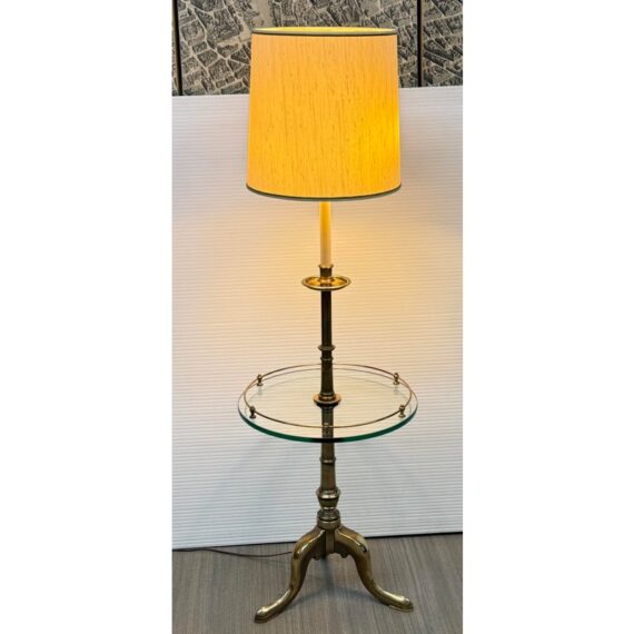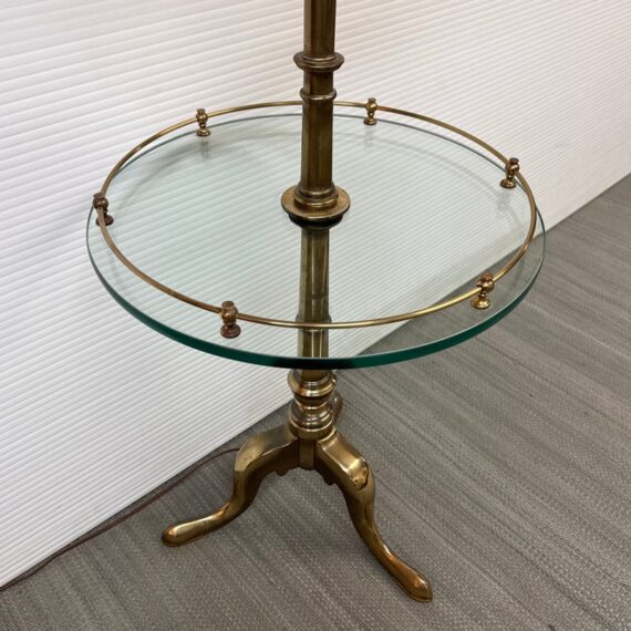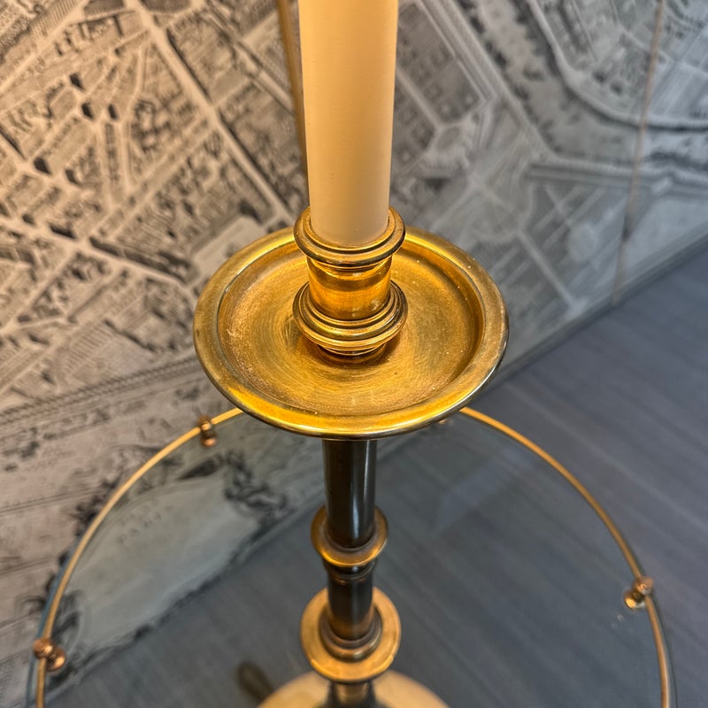 Design Plus Gallery presents a Vintage Stiffel Brass Floor Lamp with integrated glass table. Beautiful turned brass column, rising from a tripod base, is accented with an ivory “candle” that holds a double socket with pull chains. The convenient glass round table sports a brass rail to keep your items on the table. Light wear; condition is good for age and use.