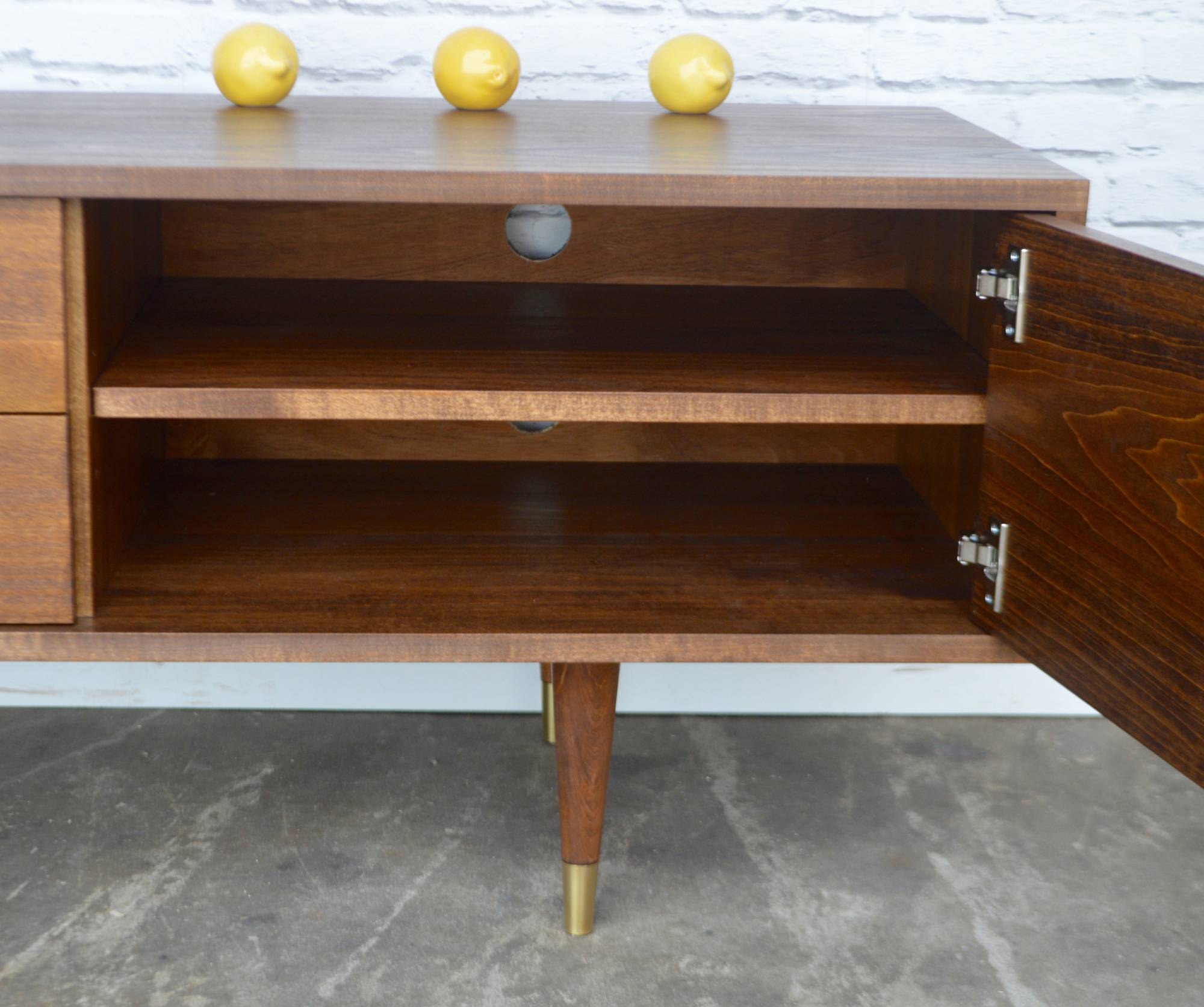 Design Plus Gallery presents the Rosedale credenza from STOR New York. The perfect combination of elegance and versatility, the Rosedale credenza has beautiful cleans lines and a sophisticated low profile. Ample storage found behind two doors, With brushed stainless finger polls, and two drawers. Handmade with care patience and attention to detail, this beautiful walnut piece can be an heirloom.