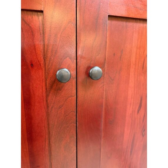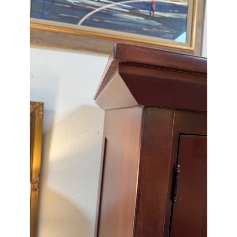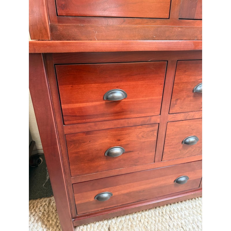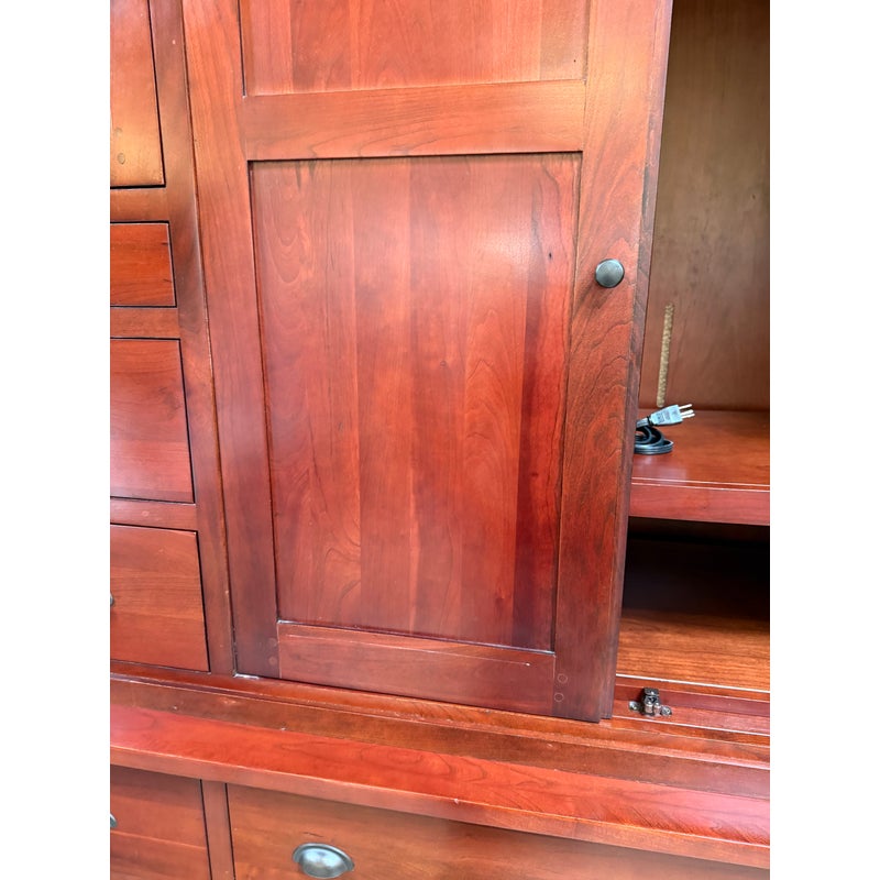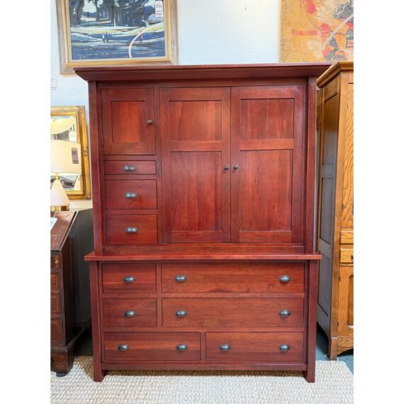 Design Plus Gallery presents a Nauvoo Bedroom Collection Media Armoire by Stuart David. The armoire is a fest to your eyes with all its varying shaped drawers and cubbies. It stands tall with two pieces that separate to easily move and position in your home. This collection focuses on high-quality solid wood construction and was customized with a cherry wood stain and nickel-plated hardware. The lower portion has six drawers of varying widths and similar depth. The top portion has two cabinet doors that open to a sliding tray meant to hide your media when not in use and is on the right side. The left side has a top single door that opens to reveal shelving and two lower drawers. This style of media armoire is no longer in production with the brand and is in good condition for its usage. Made in the USA.