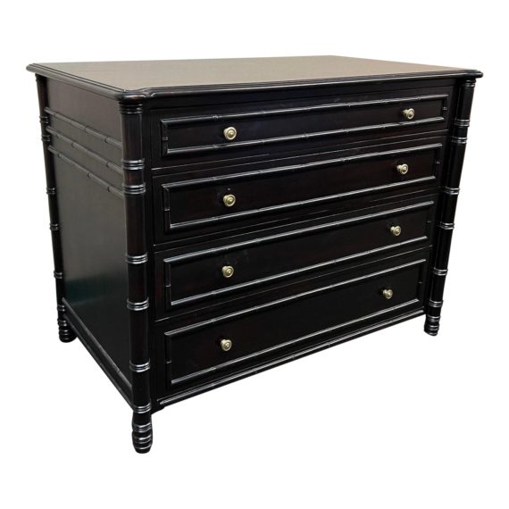 Design Plus Gallery presents a Mandalay Faux Bamboo Dresser by Stuart Membery Home. This beautiful piece combines classic elegance with a touch of modern sophistication. The dresser are expertly crafted from mahogany and veneers, showcasing the natural beauty and warm tones of the wood. The faux bamboo design adds a unique and stylish element to the piece, creating a sense of luxury and charm. The dresser’s features soft close drawers, providing a seamless and quiet closing experience. The solid brass drawer pulls add a touch of opulence and are not only functional but also serve as a decorative element, enhancing the overall design of the dresser. With its timeless design, is a perfect addition to any bedroom or living space. It offers ample storage space for clothing, accessories, and other essentials, helping you to keep your space organized and clutter-free. Whether you are looking to create a traditional or contemporary aesthetic, this dressers are versatile enough to complement any style of decor. Visible and minor wear from usage + age.