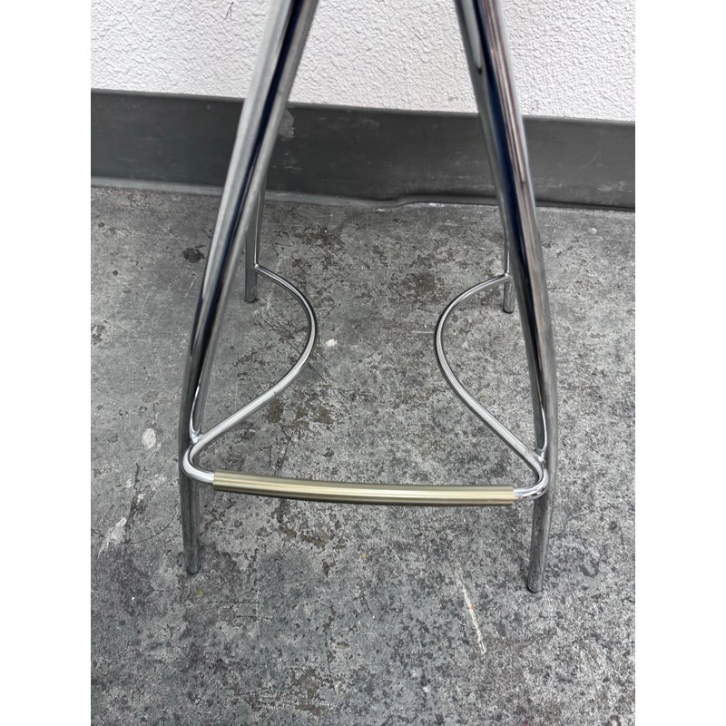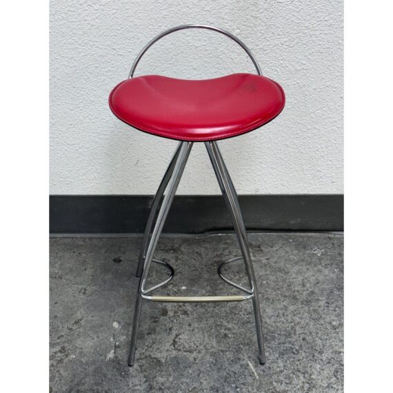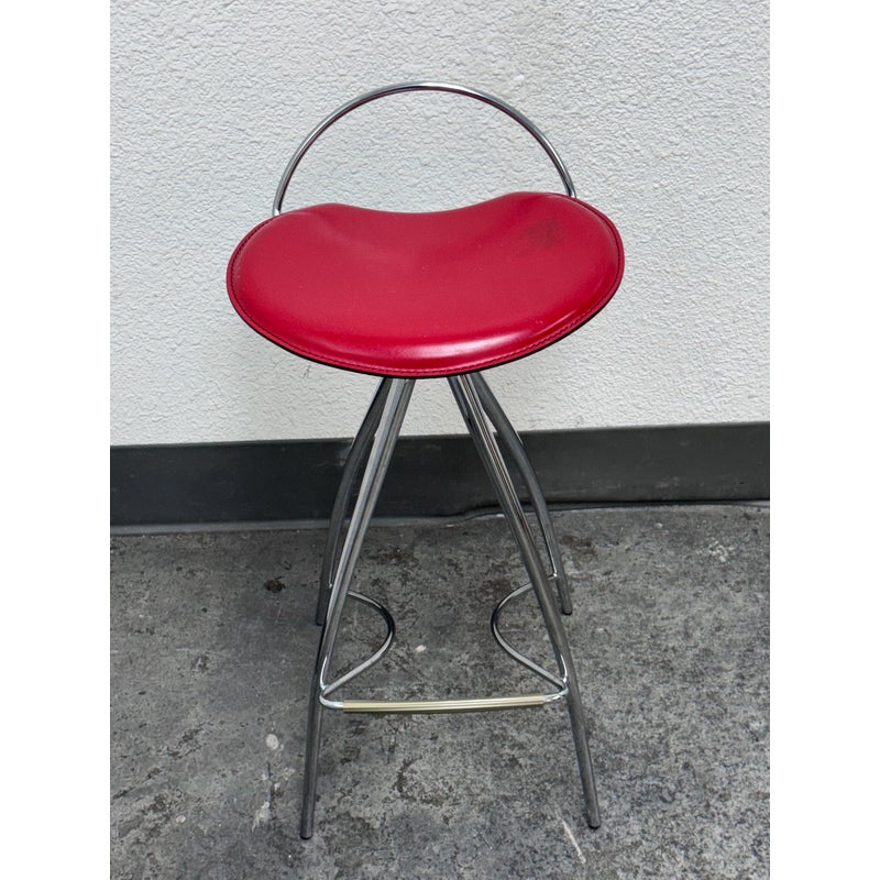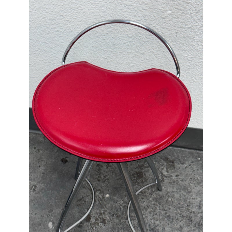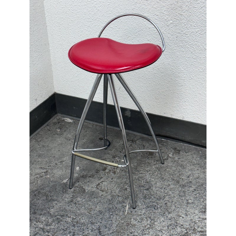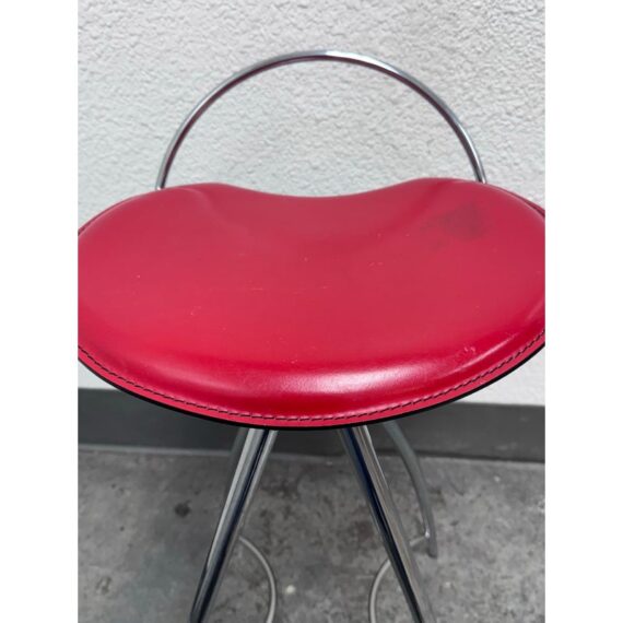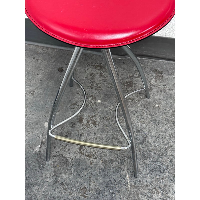 Design Plus Gallery presents the Coco Counter Stool designed by Studio Kronos in 1999 for Cattelan Italia. This counter-height stool reflects Studio Kronos’s forward-thinking approach to form and use, blending sculptural lines with everyday practicality. The Coco stool is defined by four elongated, converging legs that create a striking architectural base. A sinuous steel footrest connects the structure, visually supporting the seat while encouraging relaxed, comfortable seating. The softly contoured seat is upholstered in red leather, showing visible distress from usage that adds character and authenticity to the piece. Its slightly eccentric profile was intentionally conceived to support function, comfort, and social interaction, making it especially suitable for contract and hospitality interior design projects. The Coco counter stool stands out as both a functional seating solution and a sculptural accent. In good condition, visible distress and minimal wear from usage. Made in Italy.