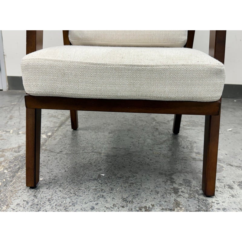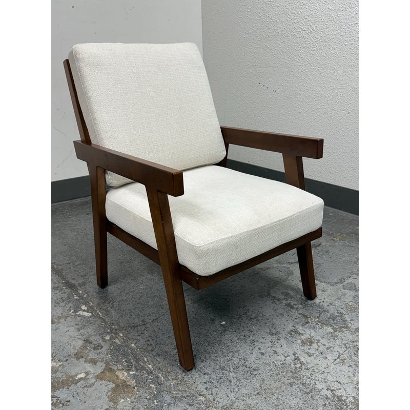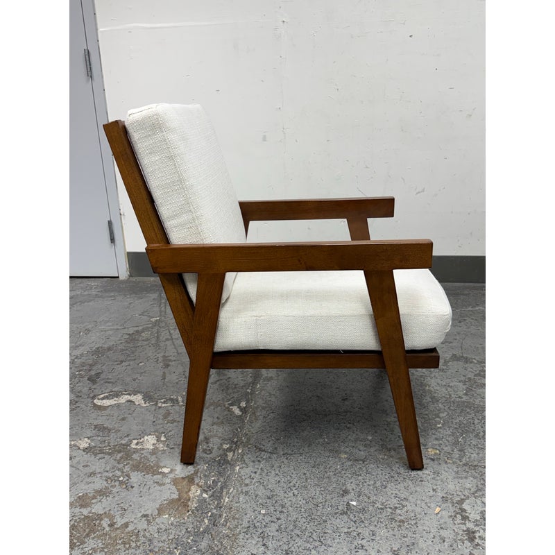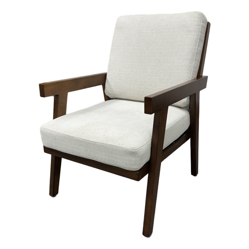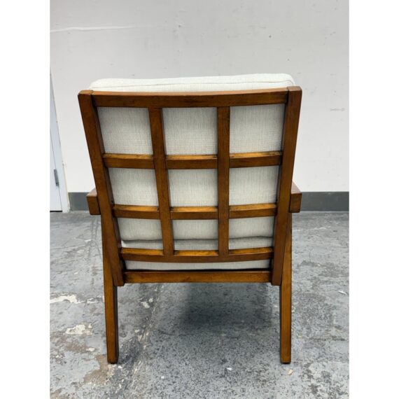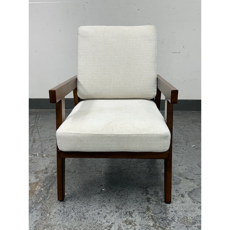 Design Plus Gallery presents the Grantsville Accent Chair by Studio McGee from Target. The chair has a wooden frame with grid like patterned back and two loose pillows for the seat and seat back. It is in good condition, visible wear on fabric. Would benefit with a professional cleaning.