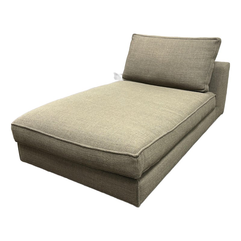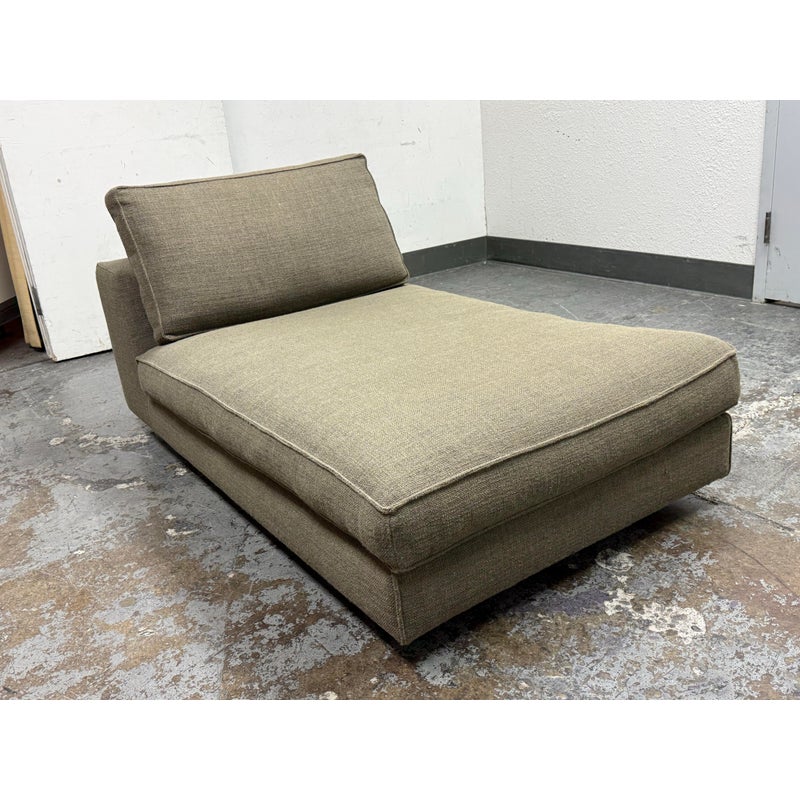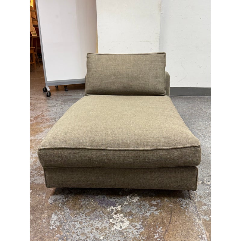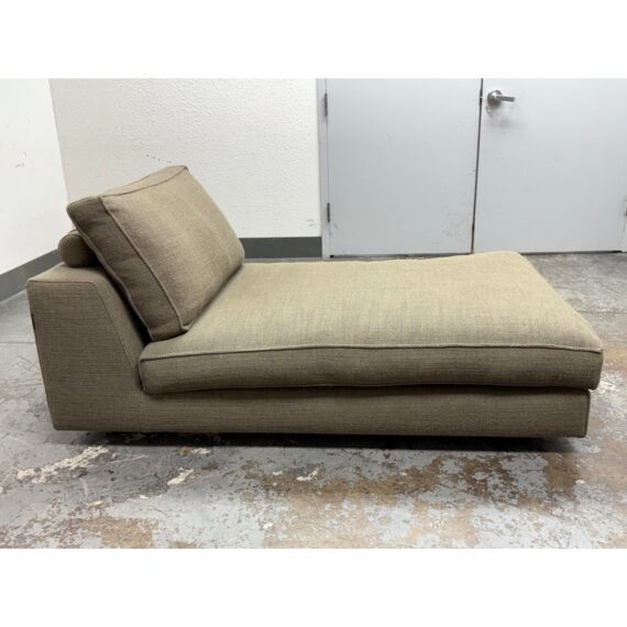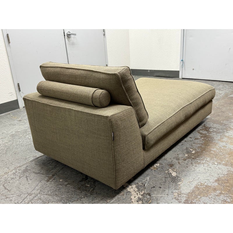 Design Plus Gallery presents a Eole Chaise Lounge by Studio Roche Bobois. Upholstered in a khaki upholstery made from a blend of wool + synthetic fibers. It also offers self welted details over its solid wood with cross-webbing elastic strap suspension. There are luxury covers that wrap sumptuous feather wrapped foam inserts which can removed or changed. Cylinder pillow holds back cushions in place. Elevated slightly on brushed stainless steel feet. In good condition, minimal discoloration from sun exposure. Made in France.