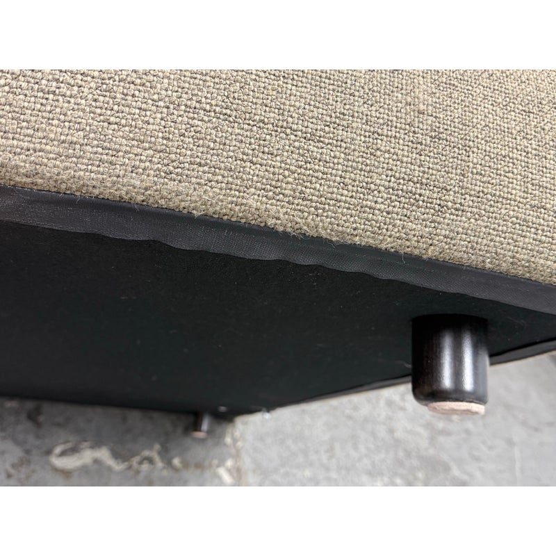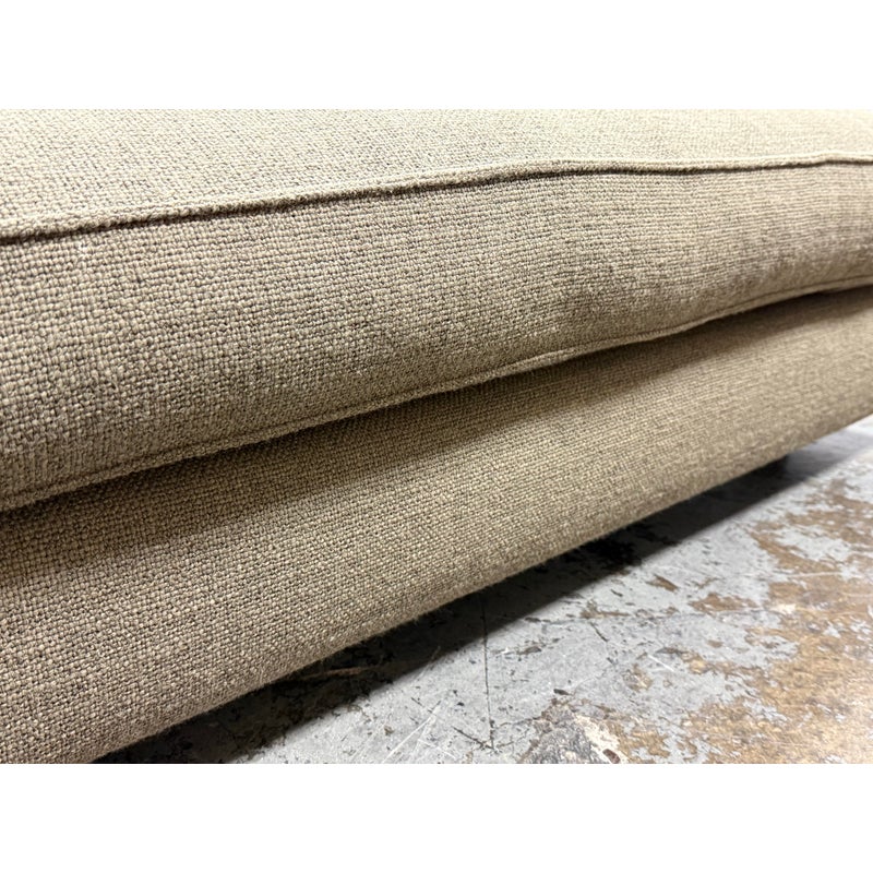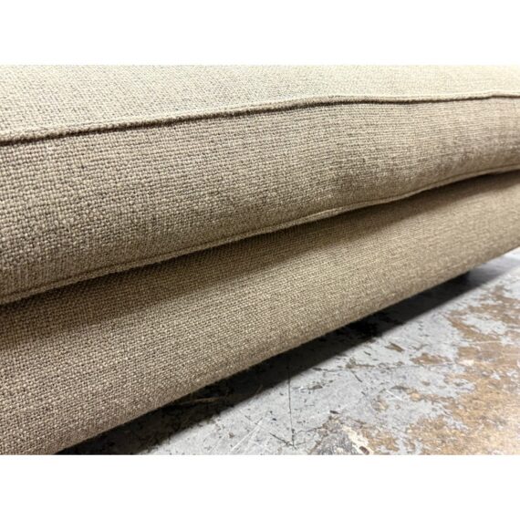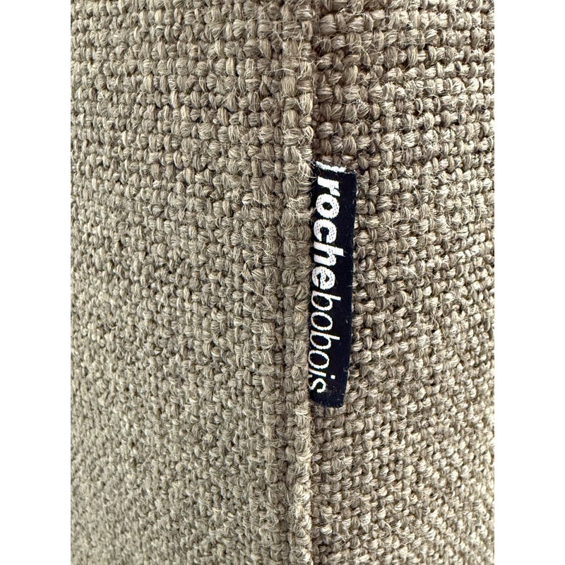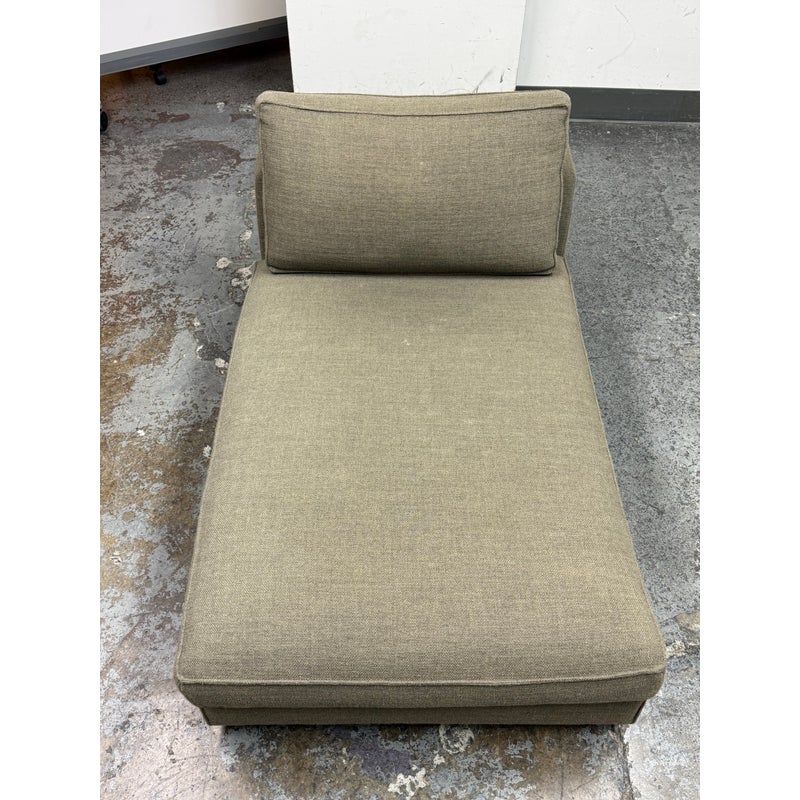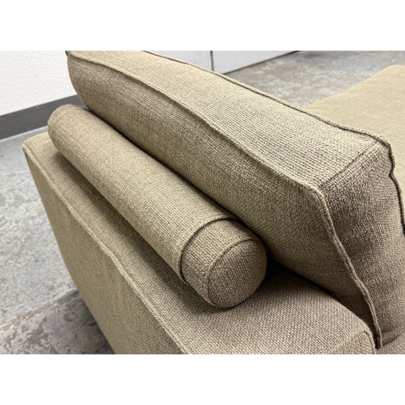 Design Plus Gallery presents a Eole Chaise Lounge by Studio Roche Bobois. Upholstered in a khaki upholstery made from a blend of wool + synthetic fibers. It also offers self welted details over its solid wood with cross-webbing elastic strap suspension. There are luxury covers that wrap sumptuous feather wrapped foam inserts which can removed or changed. Cylinder pillow holds back cushions in place. Elevated slightly on brushed stainless steel feet. In good condition, minimal discoloration from sun exposure. Made in France.