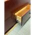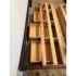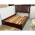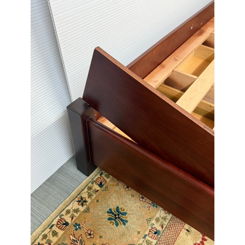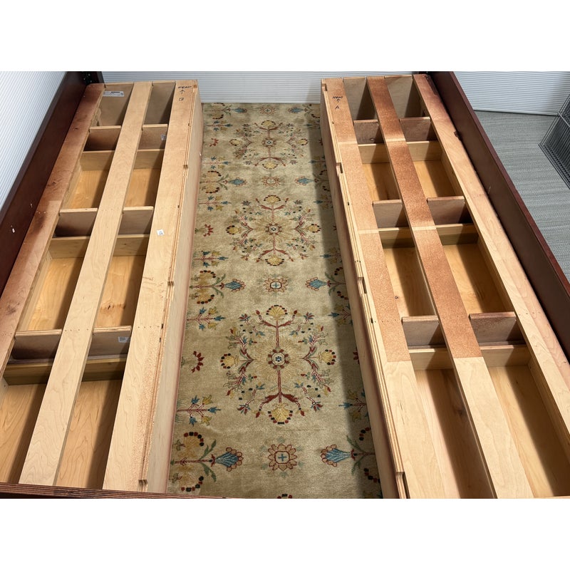 Design Plus Gallery presents a queen size wood platform storage bed with integrated underbed drawers on both sides and a slatted headboard. The frame is constructed with a sturdy rail system and interior support structure designed to hold a mattress securely while incorporating six total drawers, with three on each side, for organized storage. The headboard showcases vertical slat detailing, adding dimension and structure to the overall design. Smooth-gliding drawers provide accessible storage with a streamlined front profile that aligns with the bed frame. The wood grain and joinery reflect quality construction and durability. The bed is in good condition with visible and minimal wear from usage.