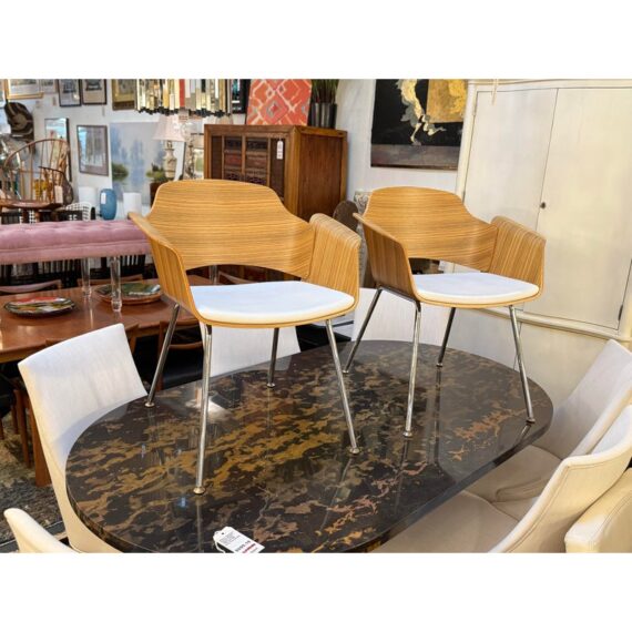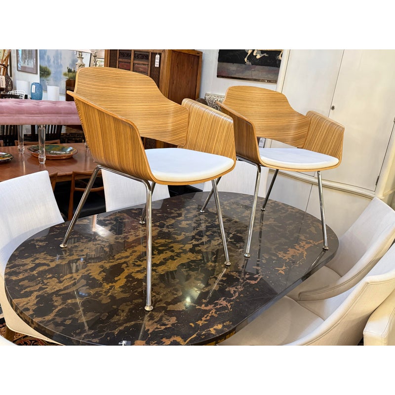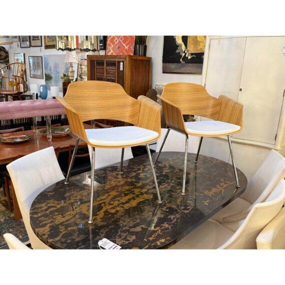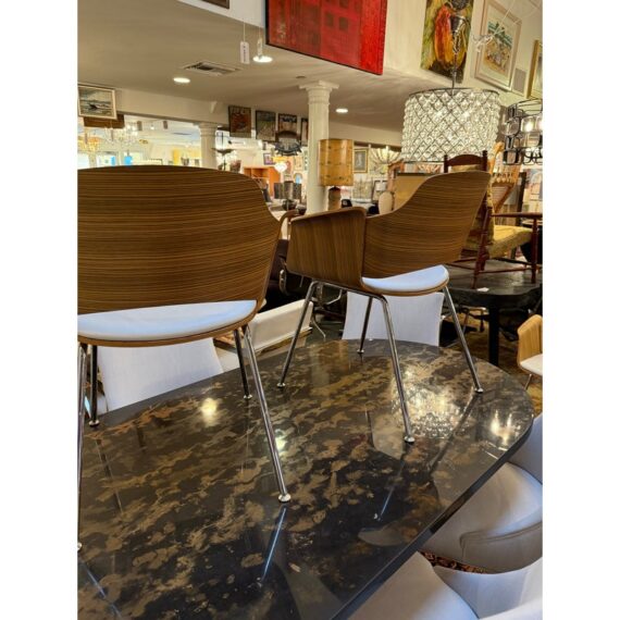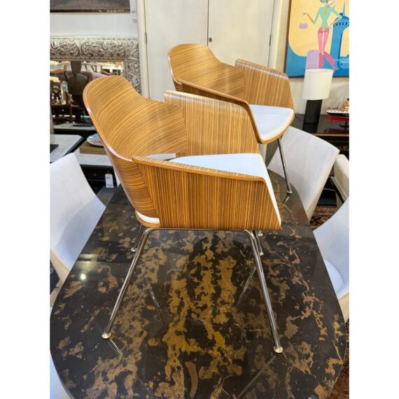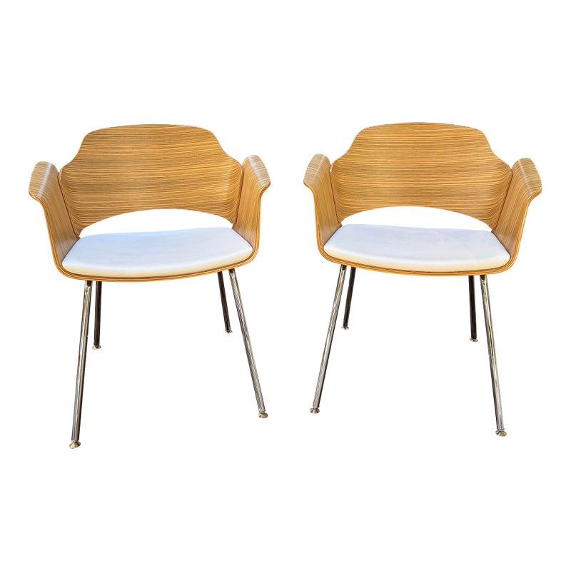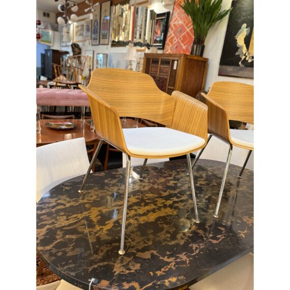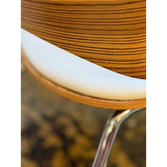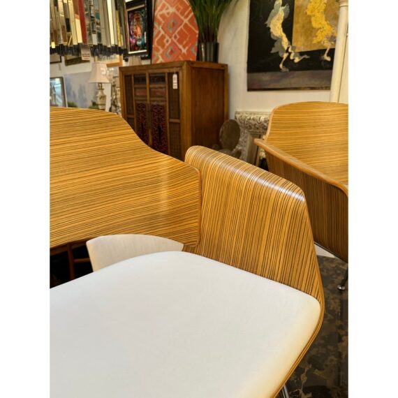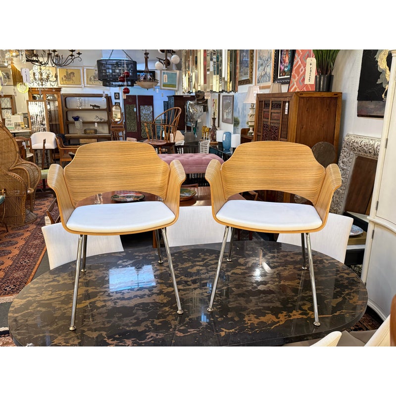 Design Plus Gallery presents a Pair of Quest Bentwood Lounge Chairs for Stylex. The design showcases a gentle curvature and soft flowing contours along the back and arms, providing both visual harmony and ergonomic comfort. The seat is topped with a thin cushioned ivory-white pad. Each chair stands on slender steel tube legs that contribute both strength and subtle contrast. The frame finish is a Spacow Vanilla Chill a fresh, creamy hue that complements a variety of interiors. Inspired by the iconic innovations of Charles and Ray Eames, these chairs are crafted using a meticulous process: multiple layers of maple wood are laminated and artfully bent to achieve the chair’s distinct molded shape. These chairs offer a refined, adaptable look that blends seamlessly with Mid Century Modern or contemporary décor. Perfect as dining chairs in a stylish home or as multifunctional seating in an office, their graceful silhouette, comfort, and durable construction make them an enduring classic for any setting. In good condition, minimal wear. These are discontinued models. Made in the USA.