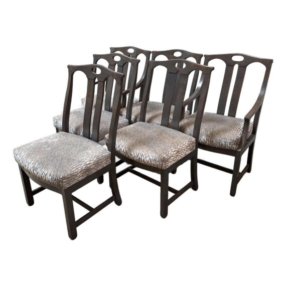 Design Plus Gallery presents a Custom Set of Six No. 30342 Dining Chairs by Summit Furniture. A classic style updated with soft curves and integrated handle, the set of wood dining chairs has a rich rubbed charcoal finish. Deeply cushioned, the two arm and four side chairs are upholstered in a textured velvet jacquard that complements the unique finish. Light wear; condition is good.