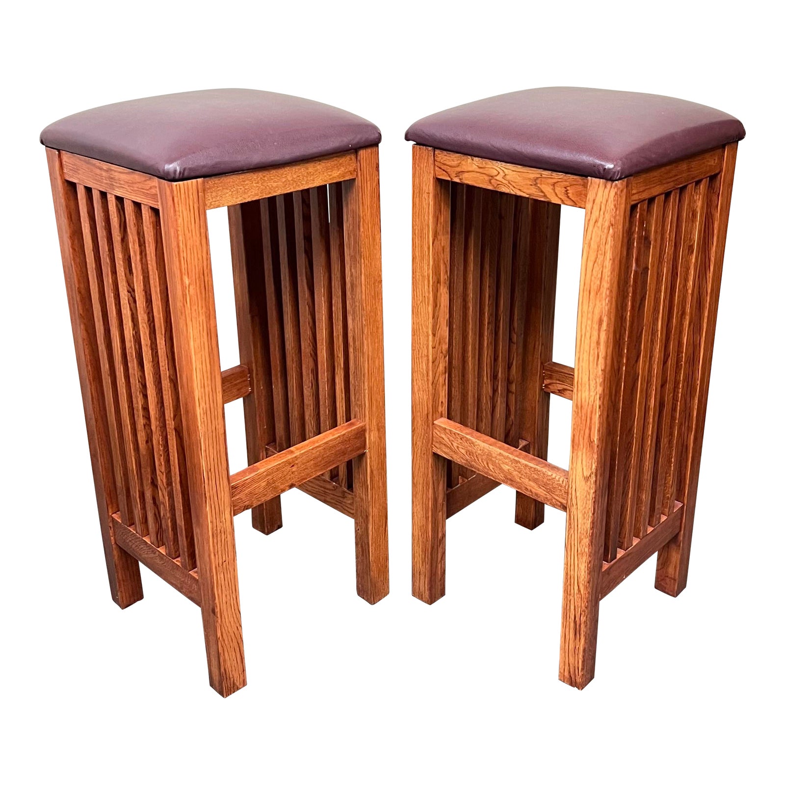 Design Plus Gallery presents a Pair of Mission Style Barstools by Sunny Designs. Oak frames with mission spindles on two sides, each features a foot rest on opposite sides. The seating is upholstered in a rustic plum upholstery. Visible and minor wear from usage.
