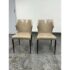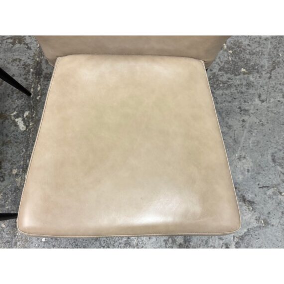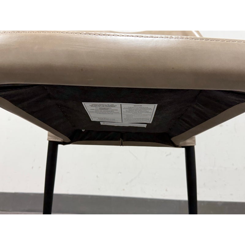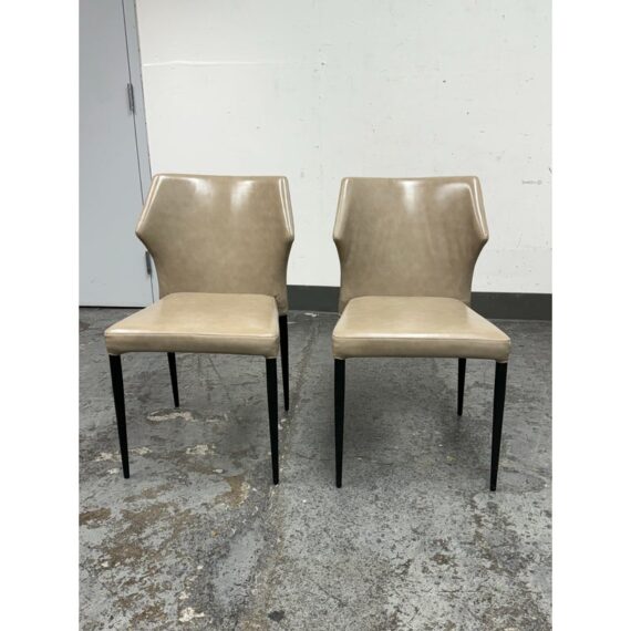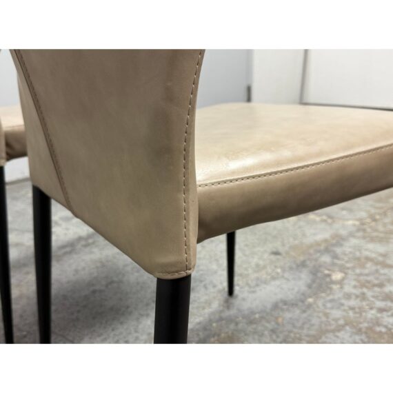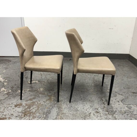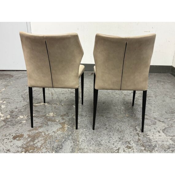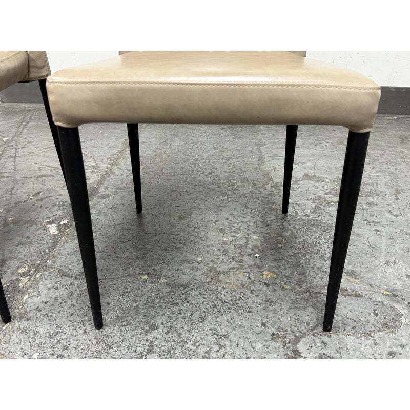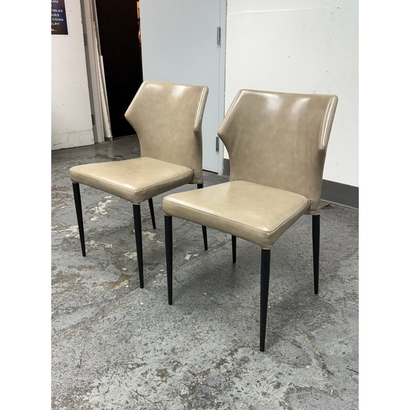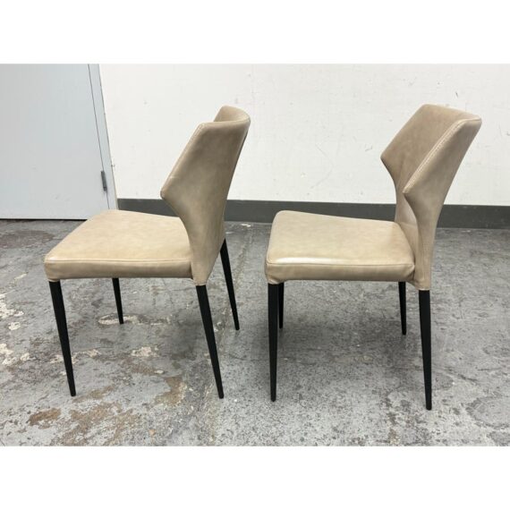 Design Plus Gallery presents a Pair of James Style Stacking Side Chairs by SUNPAN. With their distinctly shaped backrest, this pair of stackable modern dining chairs are great addition to your dining space. They are available in their color Stone, a faux leather with a stylish open seamed zipper on the back. Completed with powder-coated tapered steel legs in black. They are both in good condition for their usage. Made in Malaysia.