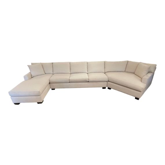 Design Plus Gallery presents a Custom 3pc Sectional by Sunrise Home. Beautifully made in a tonal off white weave with self welting details all around. The loose cushions are down wrapped foam that allows the clean lined sofa to be comfortable. There is a chaise on one end and a cuddler section at the other for ultimate lounging for your crowd. Dark stained, tapered wood legs contrast with the creamy upholstery.