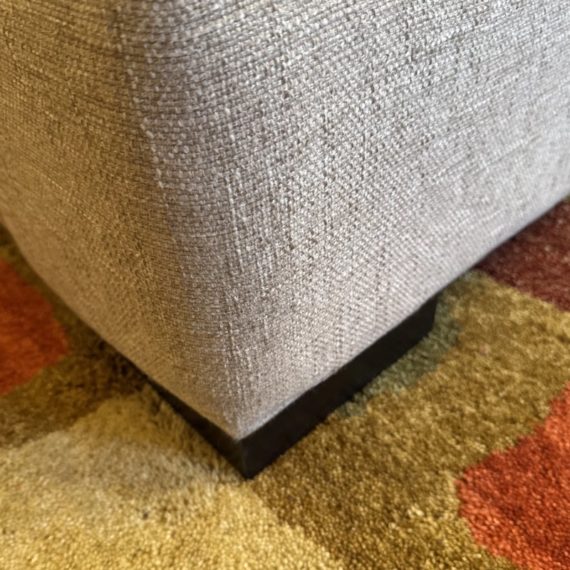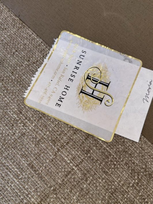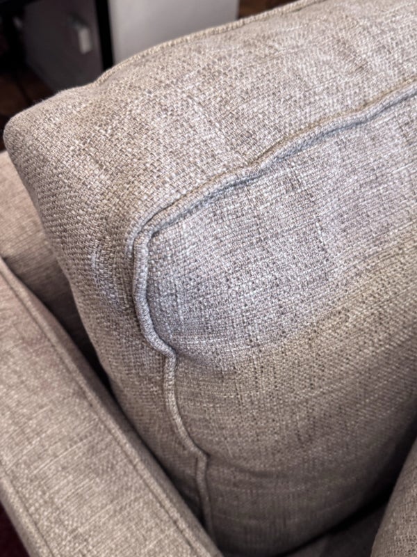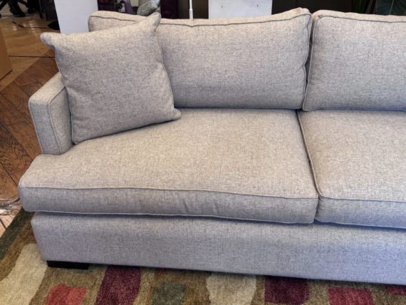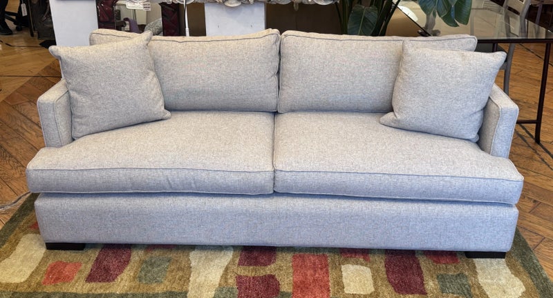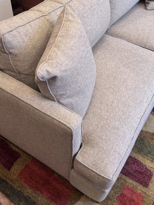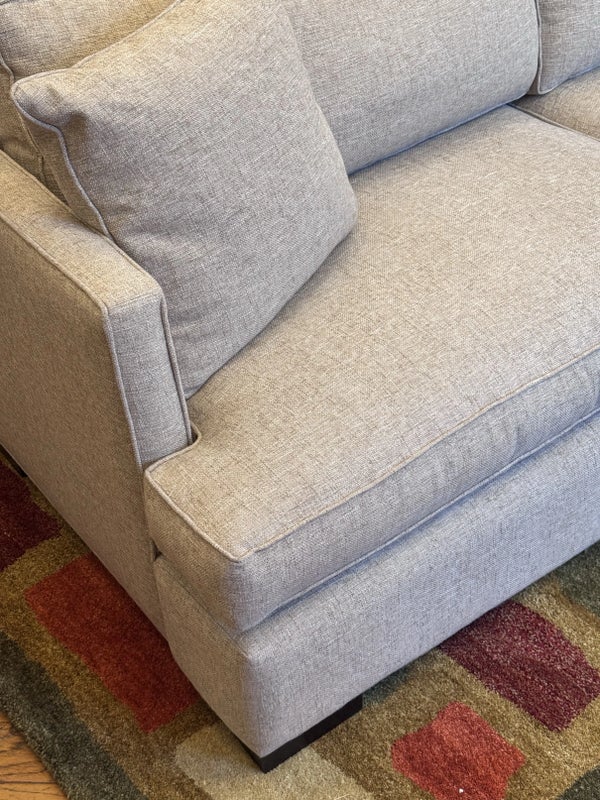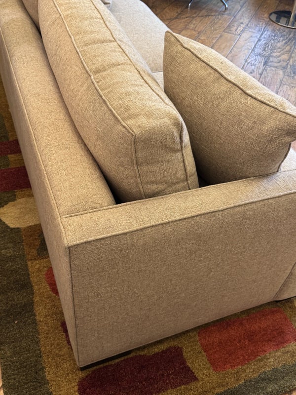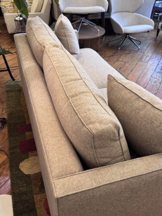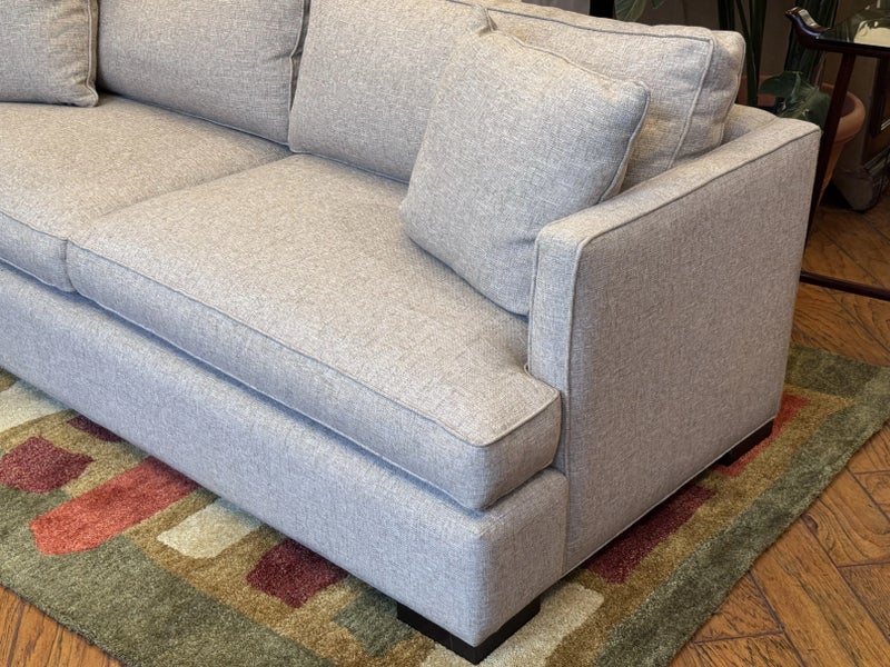 Design Plus Gallery presents a Custom Sofa by Lee Industries, Model #1601 for Sunrise Home. A neutral textured upholstery wraps the simple self welted silhouette. Firm seat cushions are complemented with down filled back cushions for hours of lounging or conversing. Minimal wear that considered good and consistent with its usage. Made in USA.
