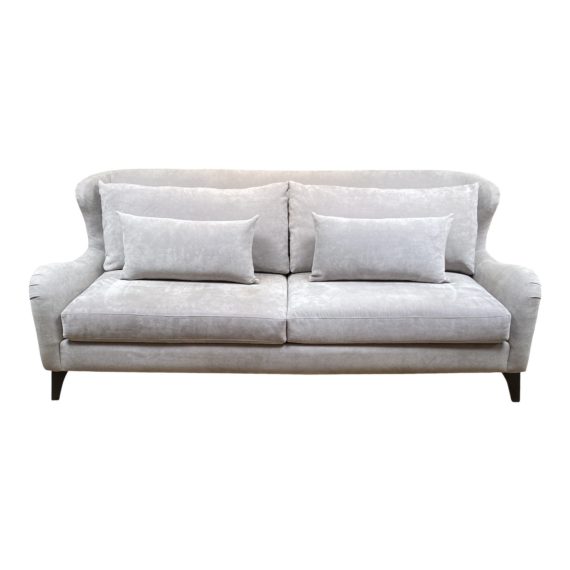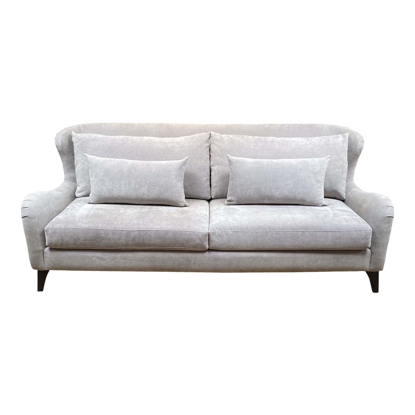 Design Plus Gallery presents a Custom Sofa by Sunrise Home. The modified wingback silhouette lends an elegance to this contemporary seating. Dove gray microfiber upholstery makes the sofa easy-care. Wide seat foam seat cushions and loose foam back and lumbar cushions provide supportive comfort. Tapered espresso legs.