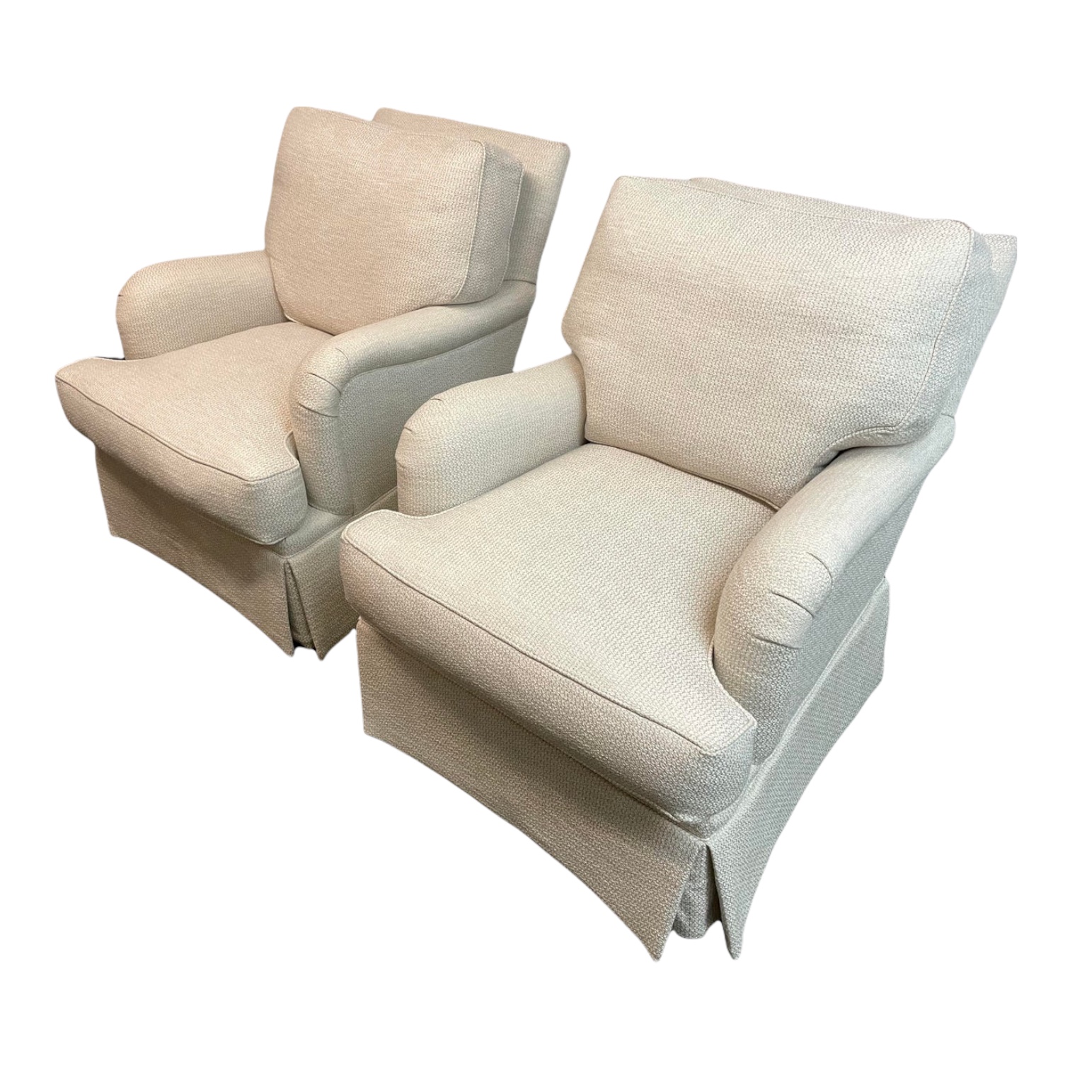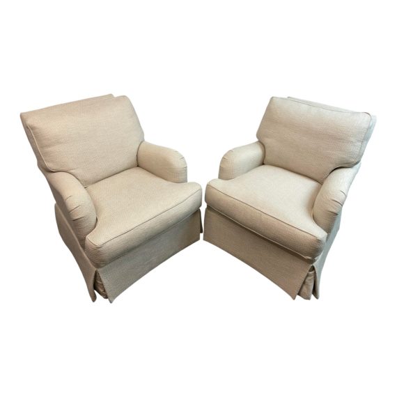 Design Plus Gallery presents a Pair of Custom Swivel Chairs by Lee Industries for Sunrise Home. Classic traditional details such as sinuous English rolled arms, self welting and tailored skirt all add to the elegance of this lovely smooth-mechanism swivel seating. Textured off white chenille wraps the kiln-dried sustainable frame and luxurious down and feather wrapped loose cushions, for a neutral, elegant pair that works beautifully in your space.