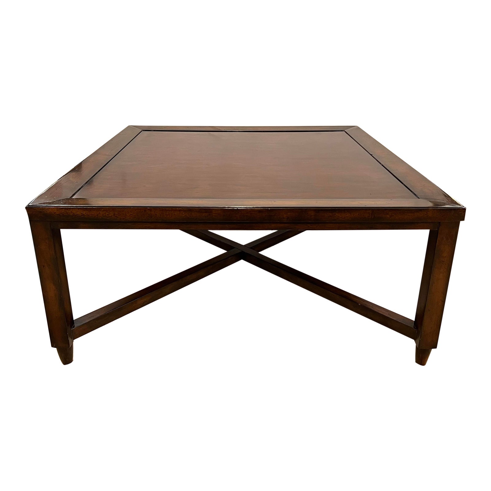 Design Plus Gallery presents the Transitional X Base Coffee Table. A square tabletop is held up with square legs. The legs are stabilized with an X cross-beam for stability. The leg portions below the X base are cylindrical and tapered. The tabletop’s borders feature distressed accents. Minor wear from use; table is in good condition.