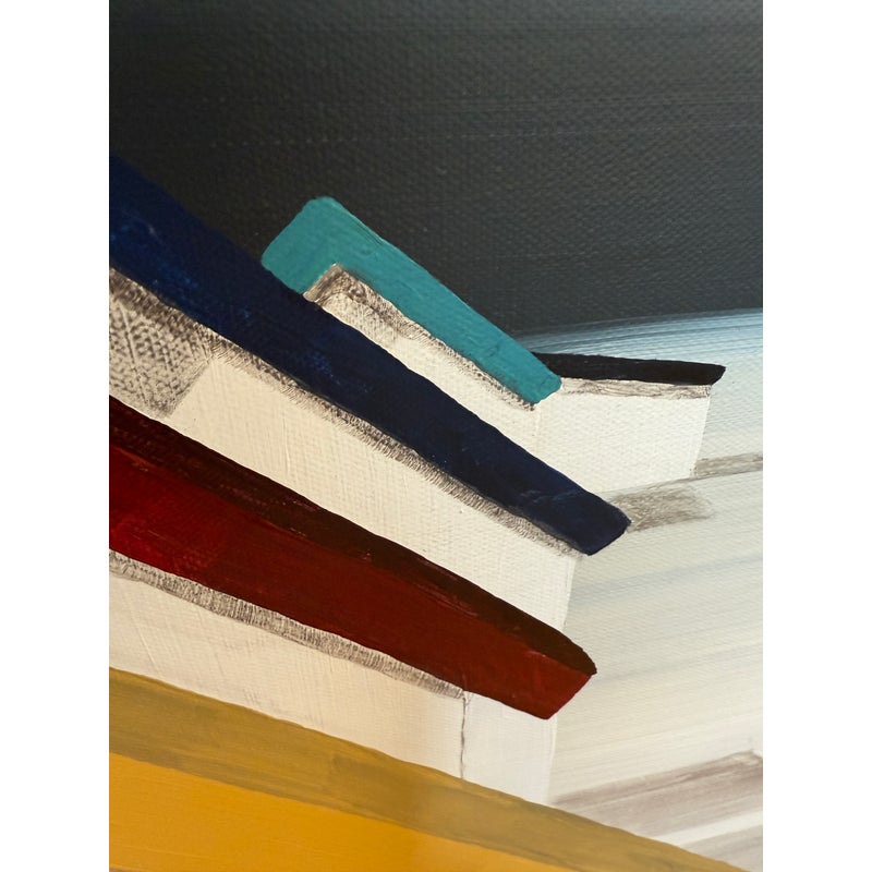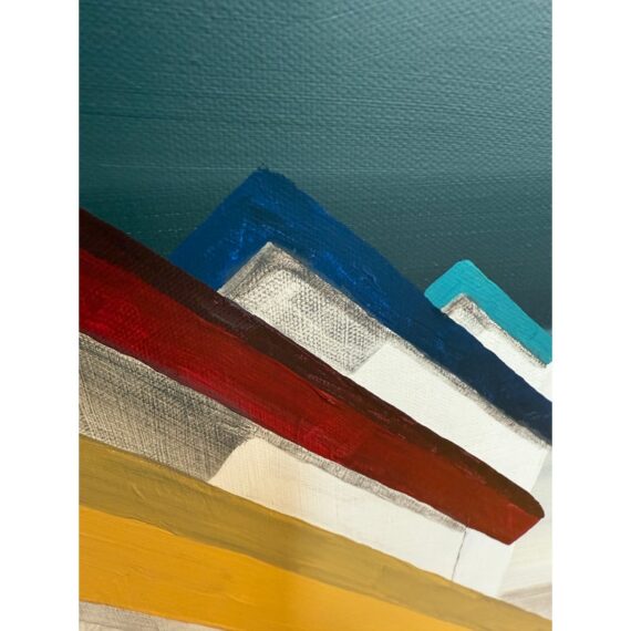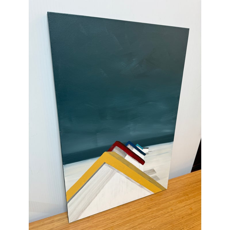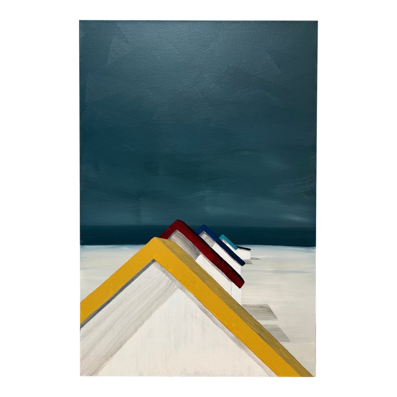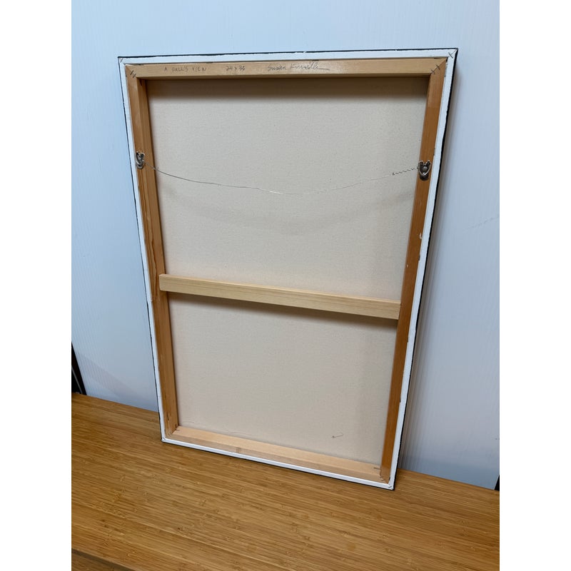 Design Plus Gallery presents “A Gull’s View” an original painting by Susan Kinsella. Seaside structures are a favorite topic of the artist, this unique piece offers another unique perspective as the horizon darkens. The large acrylic painting is a wrapped canvas, unframed. Little evidence of wear; condition is good.