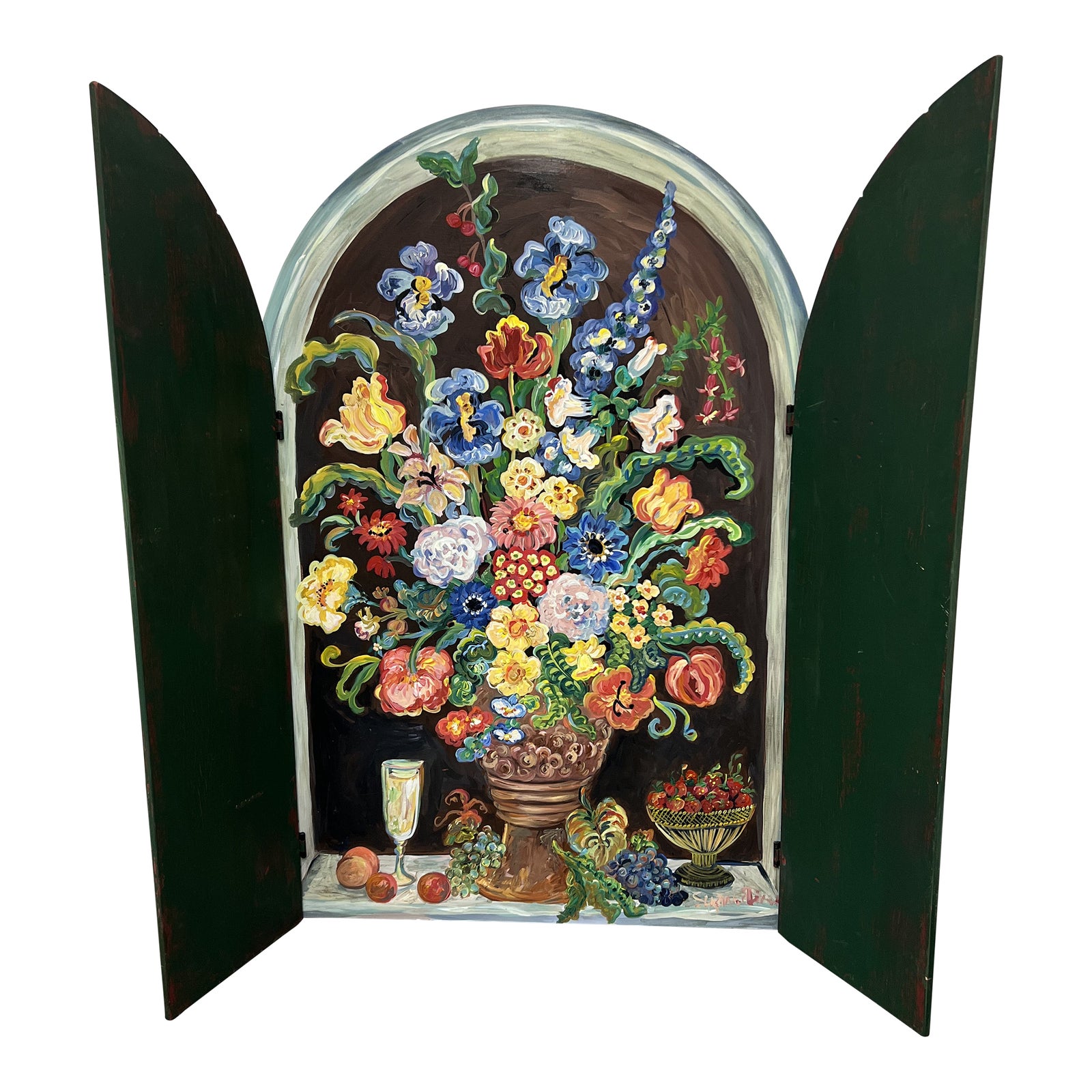 Design Plus Gallery presents a Uniquely Artistic Cottage Shutters with Flower + Fruit Basket Bouquets Wall Hanging from Suzanne Etienne. The artist, Suzanne has always appreciated painting and grew up surrounded with life forms of incorporating color. Her cottage core aesthetic is timeless, adorable, pleasant and always uplifting. This functioning cottage window shutters do open and close to display the magnificence of her artwork. Highly unusual and forever cherishable, this art work is in good condition with minor wear.