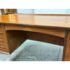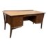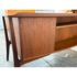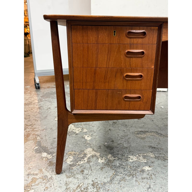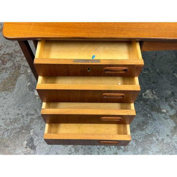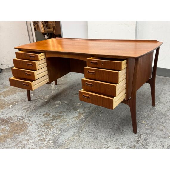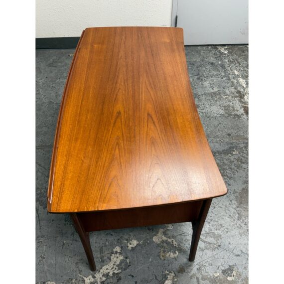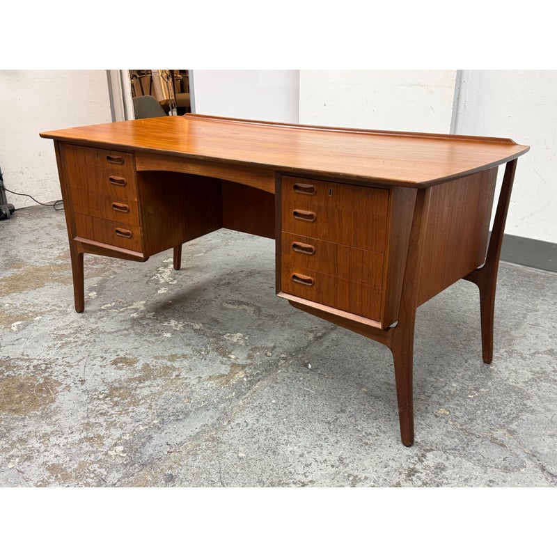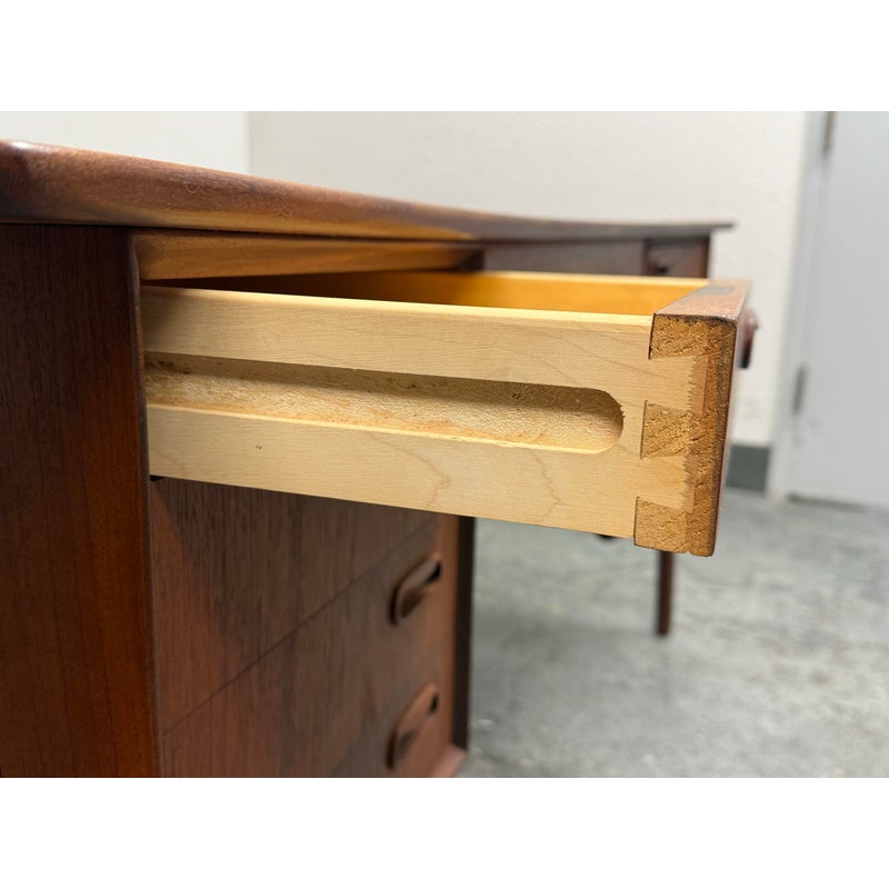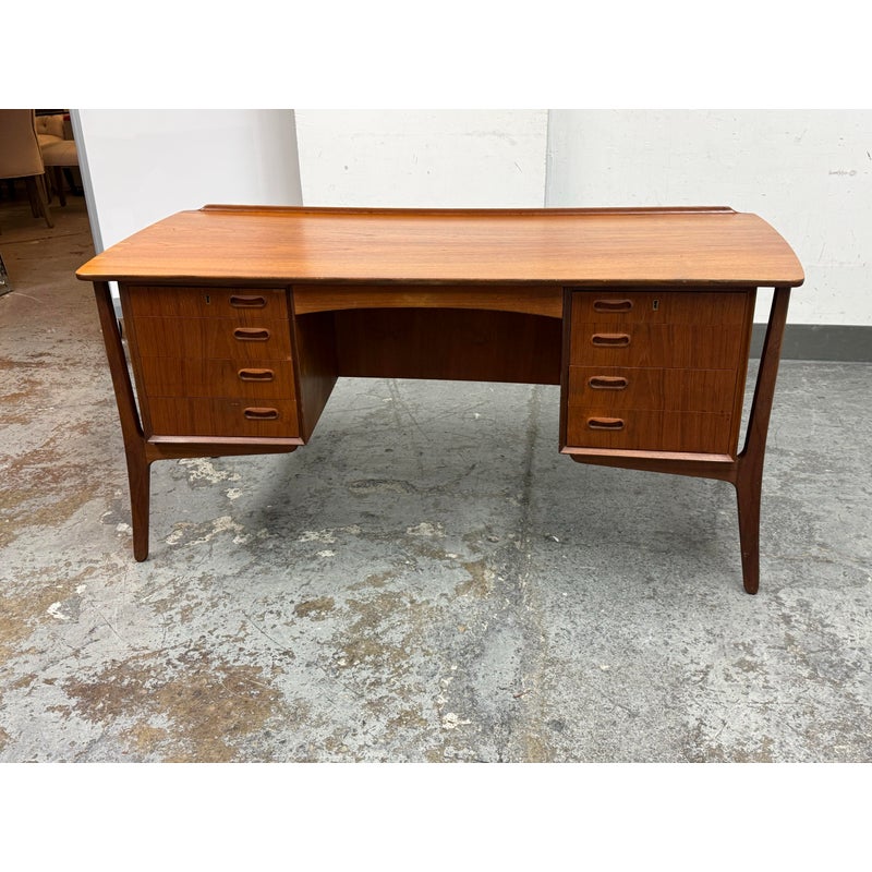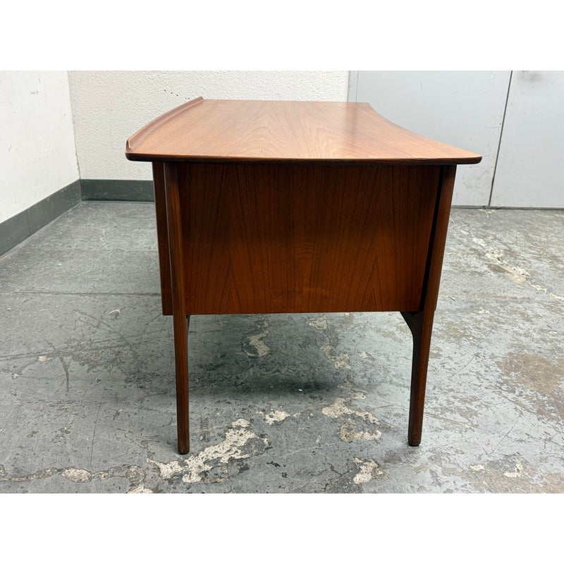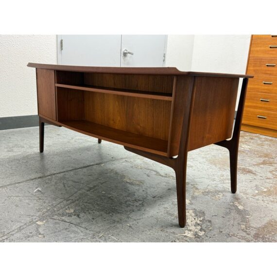 Design Plus Gallery presents a Mid 20th Century Bow Front Teak Wood Desk by Svend Aage Madsen for HP Hansen. The desk is elegant with a tapered exoskeleton legs in Afromaosia (African Teak Wood). There are drawers on either side for wonderful storage capabilities. The back side of the desk has an exposed shelf for storage of binders and the like. The piece is in good condition overall without its original key. Made in Denmark.