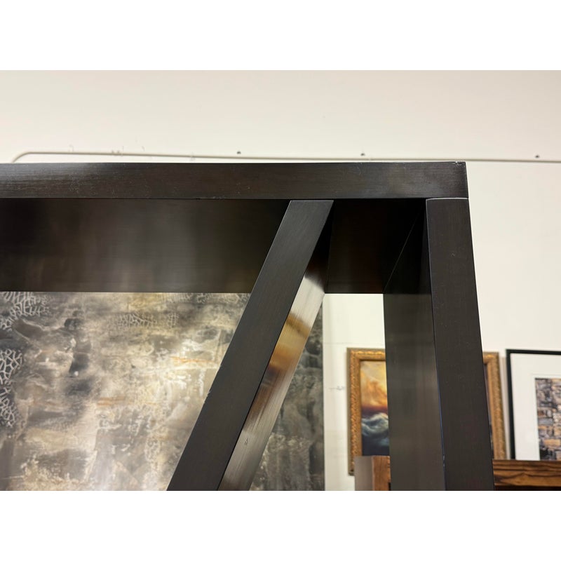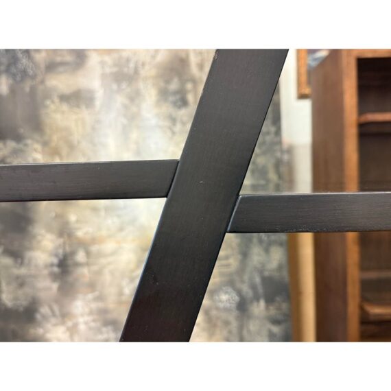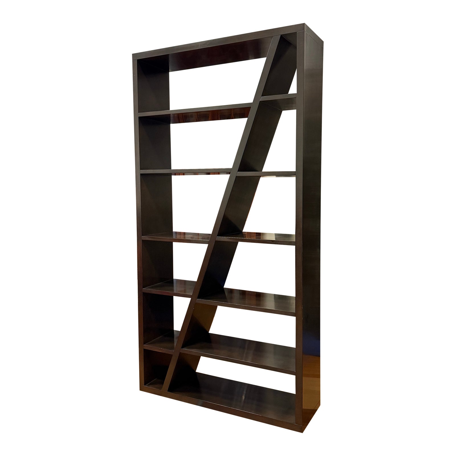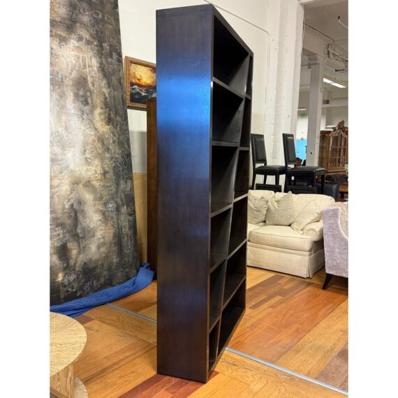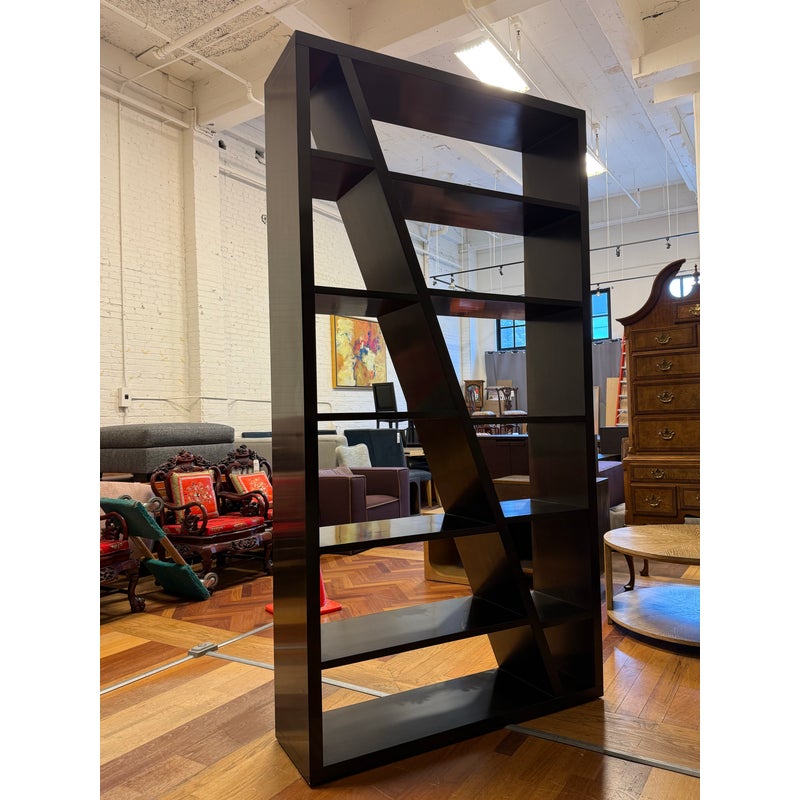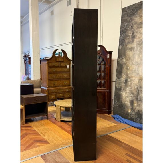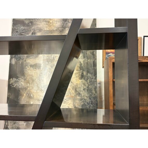 Design Plus Gallery presents the Living Room Étagère from Swaim Furniture. The design of this tall etagere is deceptive. There is a cross-angled front detail to disrupt an otherwise traditional design with compelling results. Distinctive for its details, this etagere is crafted of prized wormy maple wood. It is in good showroom like condition with minima visible surface wear for its usage.
