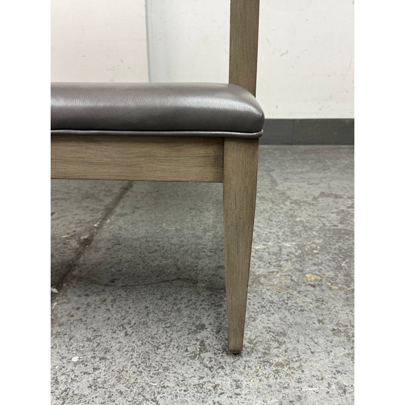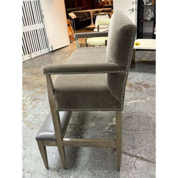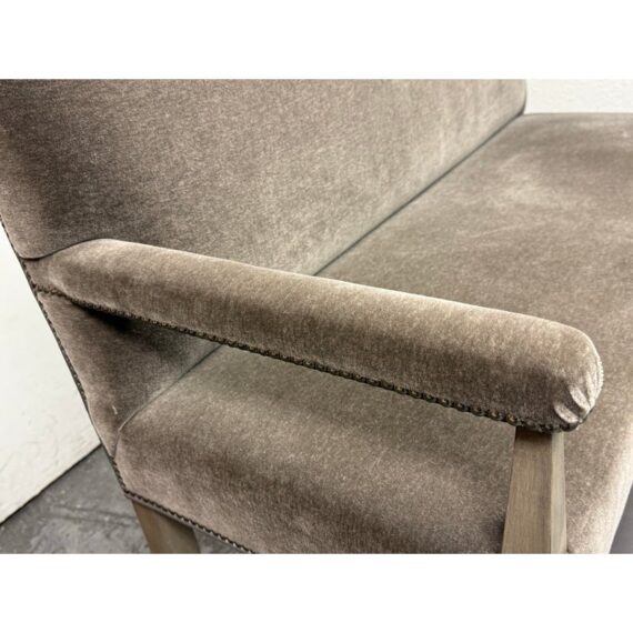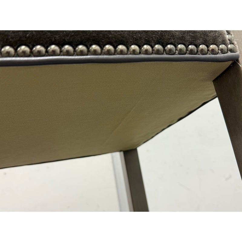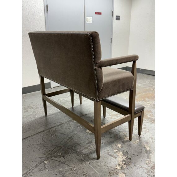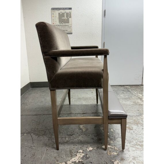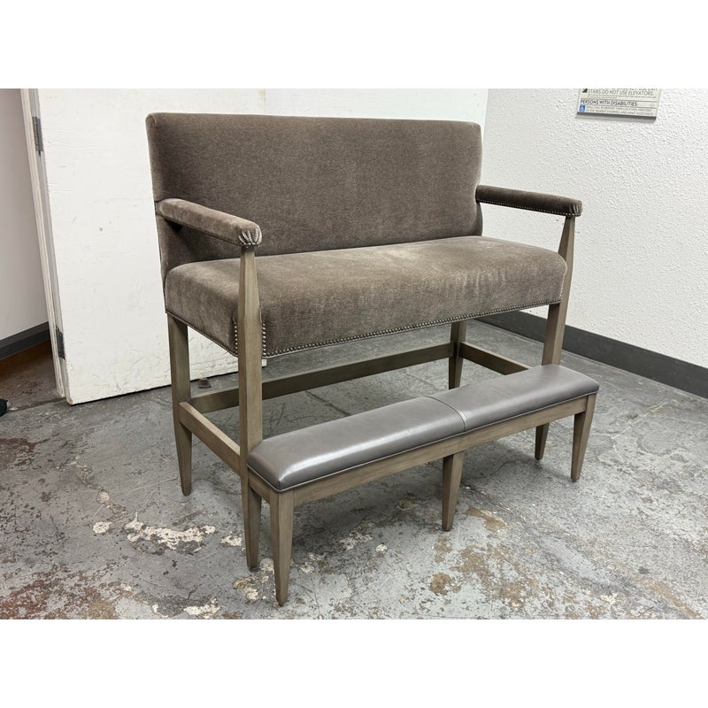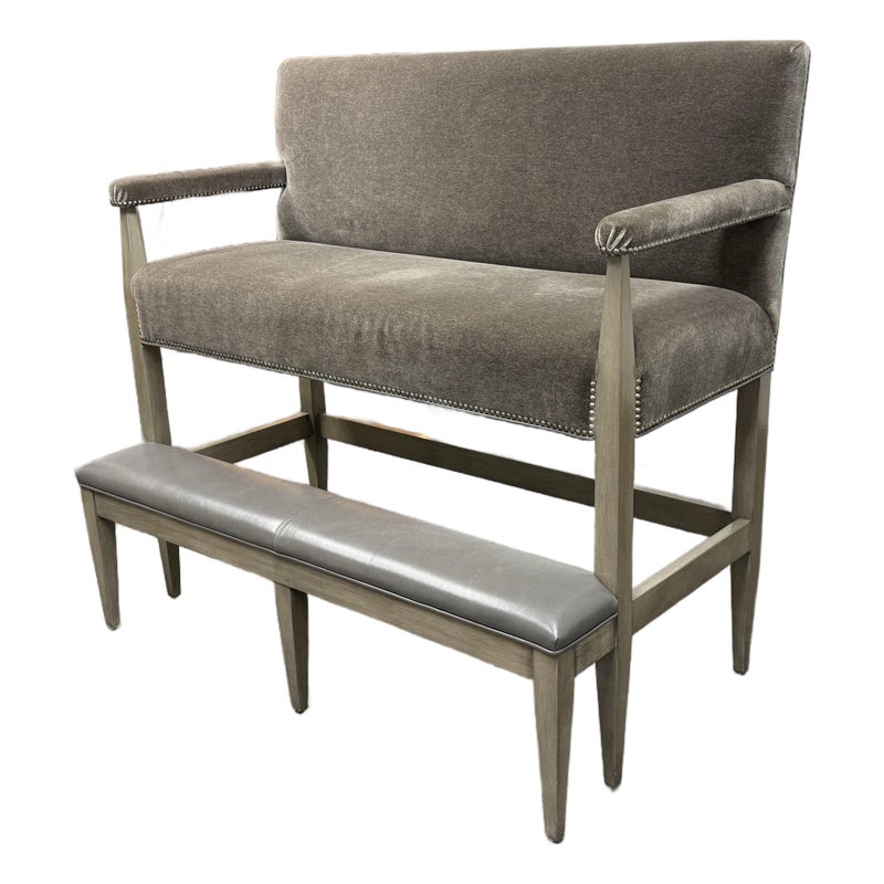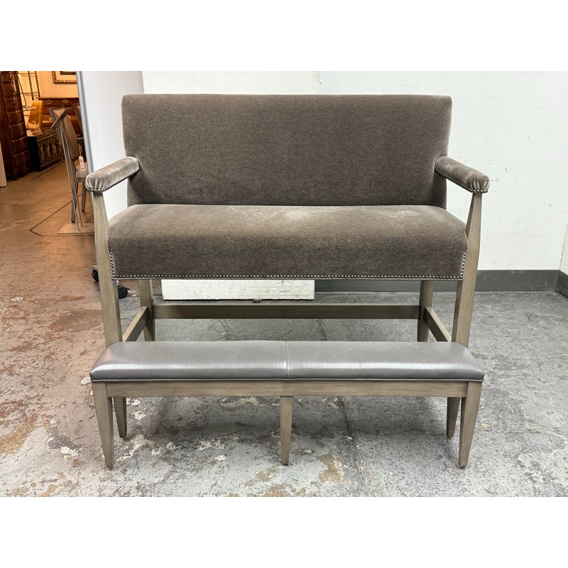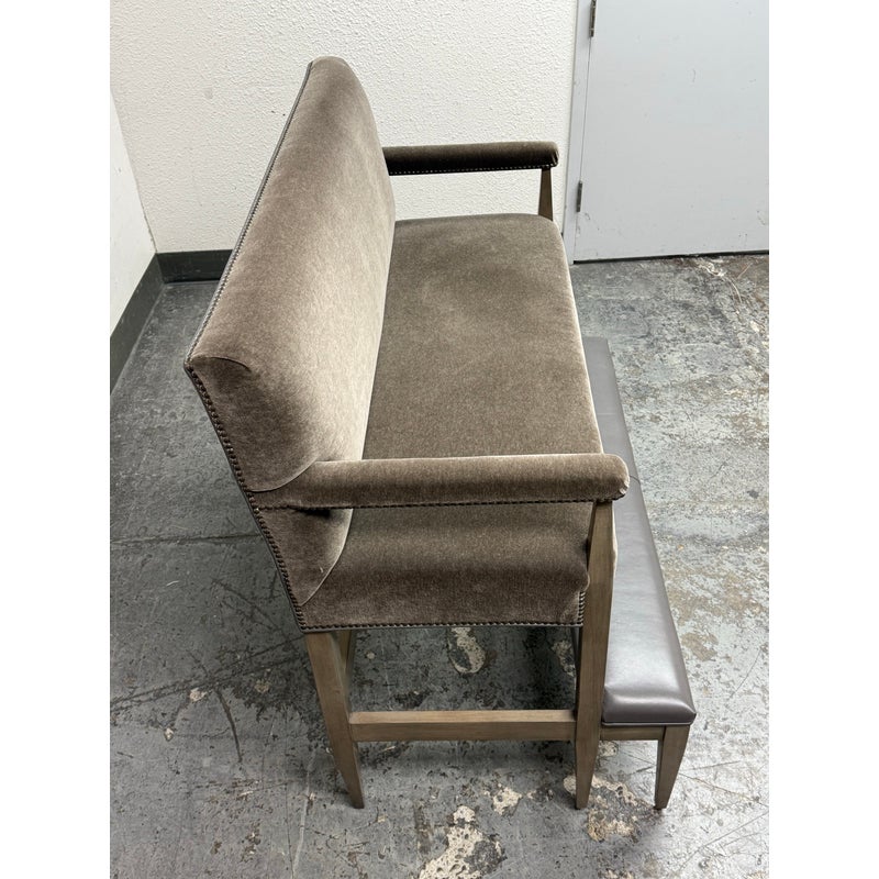 Design Plus Gallery presents a Strike Spectator Sofa from Swaim Furniture. The unique seat is almost like an elevated bench with two levels in a combination of fine textiles. The upper sofa offers a bench seat for two to three of cushioned excellence with the use of Mohair. The seams are stretched with the use of nailheads to prevent fraying over time. The wood frames offers a connection to a leather padded foot rest. The frame is a neutral greige finish, complimenting this contemporary piece. As with all Swaim Furniture the Strike Spectator sofa is expertly crafted and hand-made furniture in North Carolina where they combine artisanal skill with a dedication to quality and innovation. In good, showroom like condition.