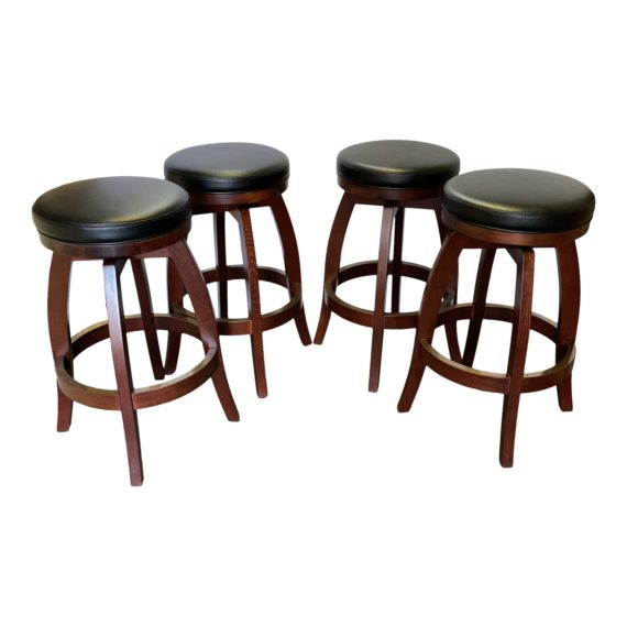 Design Plus Gallery presents a Set of Four Rustic Contemporary Bar Stools. Lightly referencing a wine barrel, the rosewood stained stools have thickly cushioned black vinyl seats and brass rail guards.