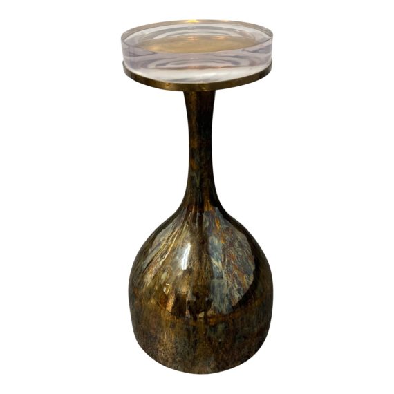 Design Plus Gallery presents the Magni, a Magnifying Decanter Drink Table from Sylvan SF. You will come to love its unique + stylish presence with your furniture. It is constructed using a labor-intensive hand hammering process, which gives it a textured and rustic look. The table is finished with a hand-polished tortoise brass industrial finish, adding to its aesthetic appeal. One of the standout features of this drink table is the subtle magnifying resin top detail. This detail creates an interesting visual effect when the table is viewed from above. Quite a modern and eye-catching piece that will stand out nicely in your home. Minor wear.
