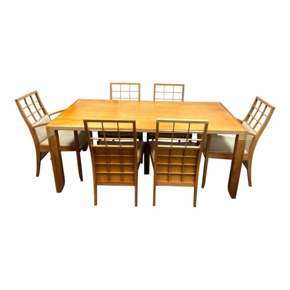 Design Plus Gallery presents a Late 20th Century Maple Dining Set by Takumi. Dovetailed corners taper slightly with the slender legs. Chairs coordinating with a sculptural back with a curved grid formation. There is visible wear through out, set is in good condition. Seat and backs are upholstered in a cream fabric. There is visible wear, chair will need a professional cleaning, set is in good condition.