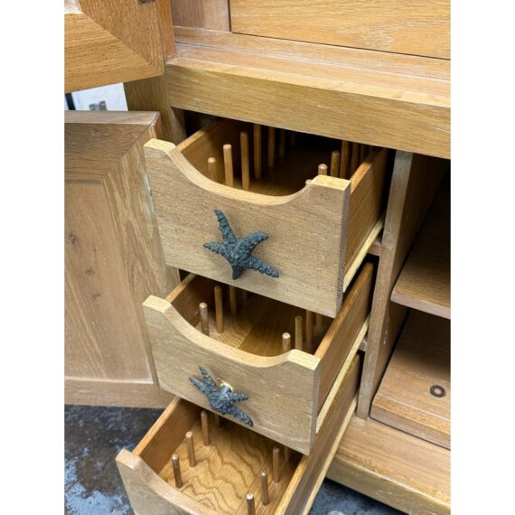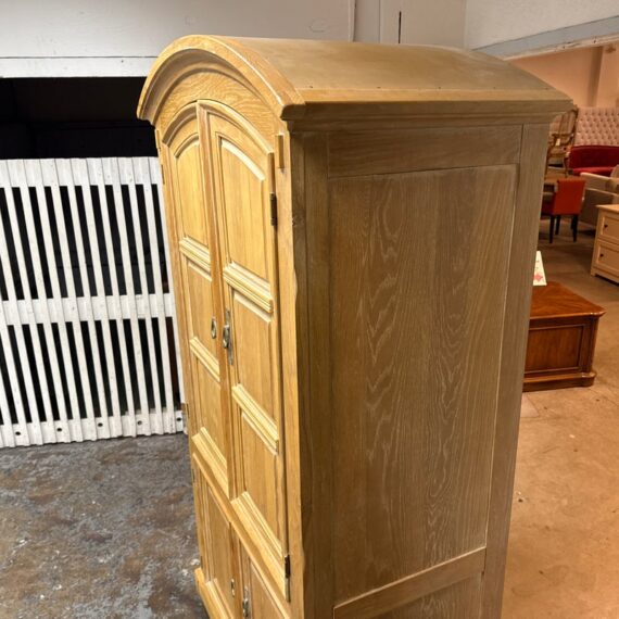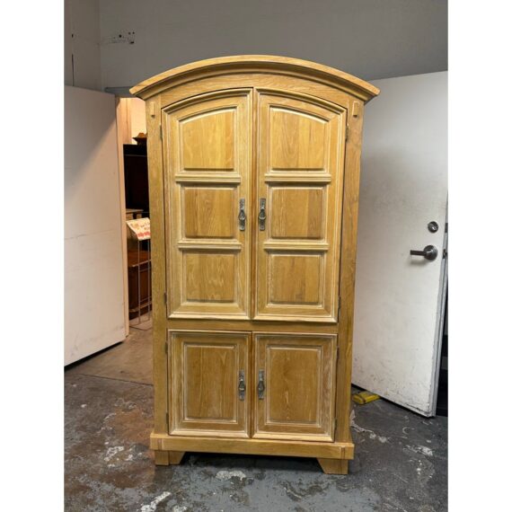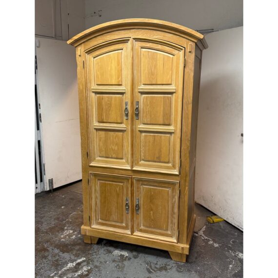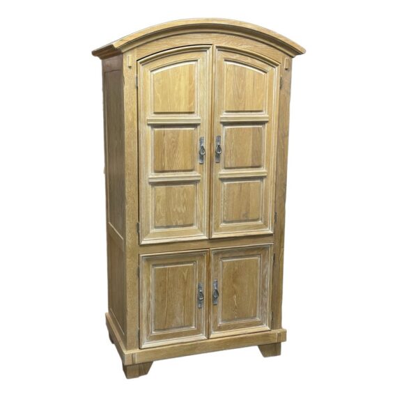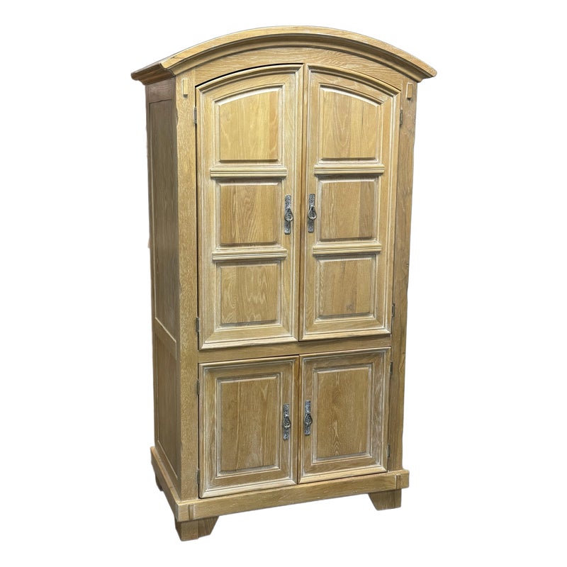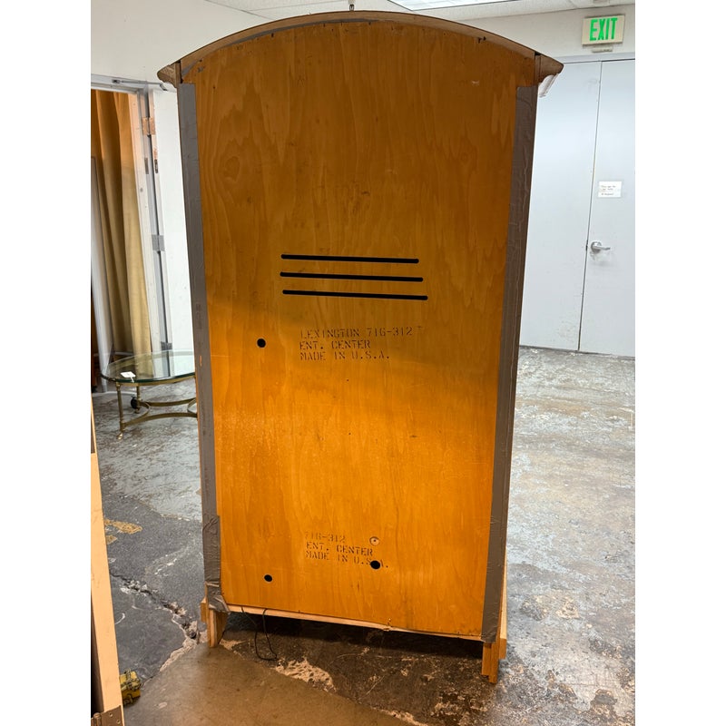Design Plus Gallery presents a Taos Entertainment Center by Lexington. Bring the breezy charm of the shoreline into your home with this stunning arched pine media center. Crafted from warm, natural pine, the unit sits gracefully with a softly arched facade, echoing waves and coastal curves. The symmetrical front features a signature two doors over two doors design, the upper set opening to reveal a spacious interior, complete with a shelf for media components or display, and a television. Adding to its coastal personality, the metal hardware on each door is shaped like starfish, evoking sandy beaches and ocean treasures. Beneath, the media center’s lower half offers open storage, on the left, three drawers provide extra storage. Finished in a sun-washed pine hue with gentle distressing, this piece brings a relaxed, sun-bleached look to any living room or den, making every day feel a little closer to the coast.In good condition, visible and minimal wear from usage. Duct tape is on the back. Made in USA.