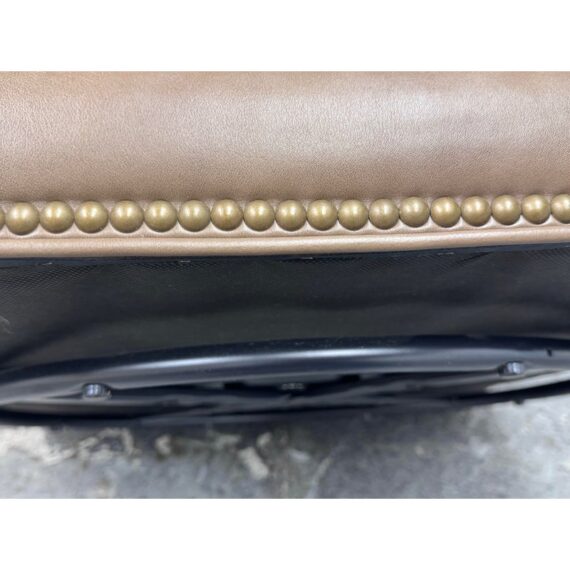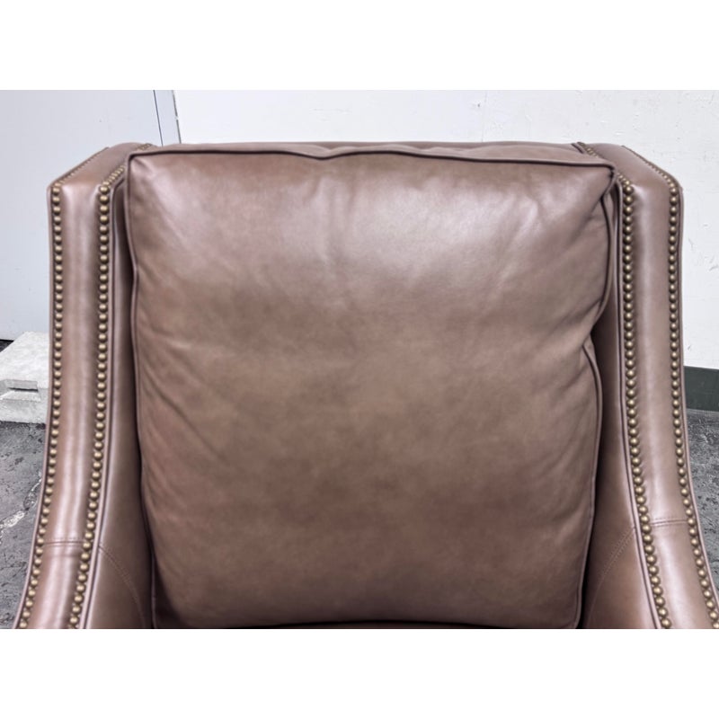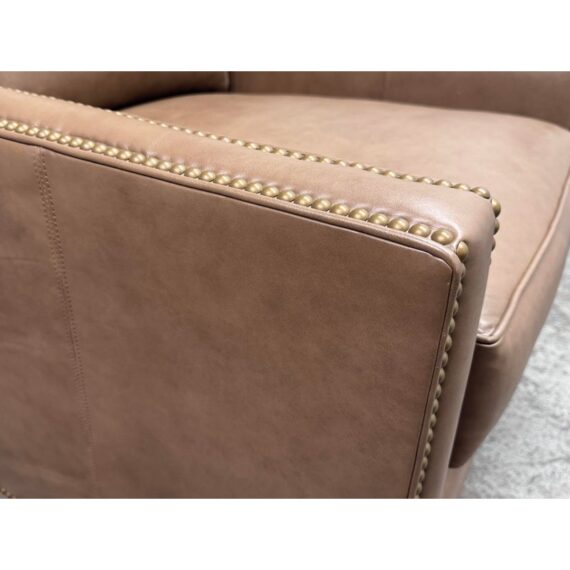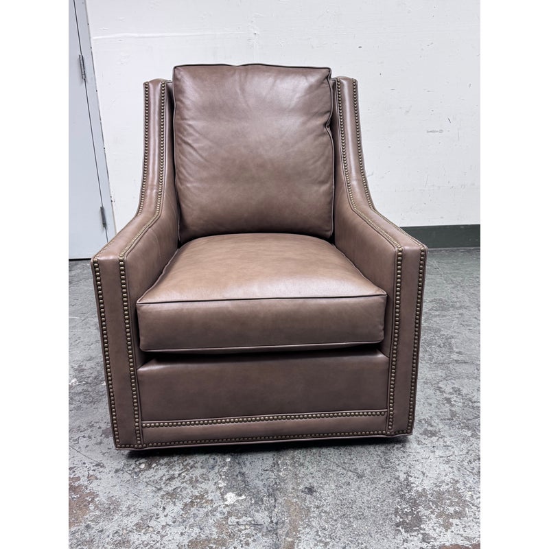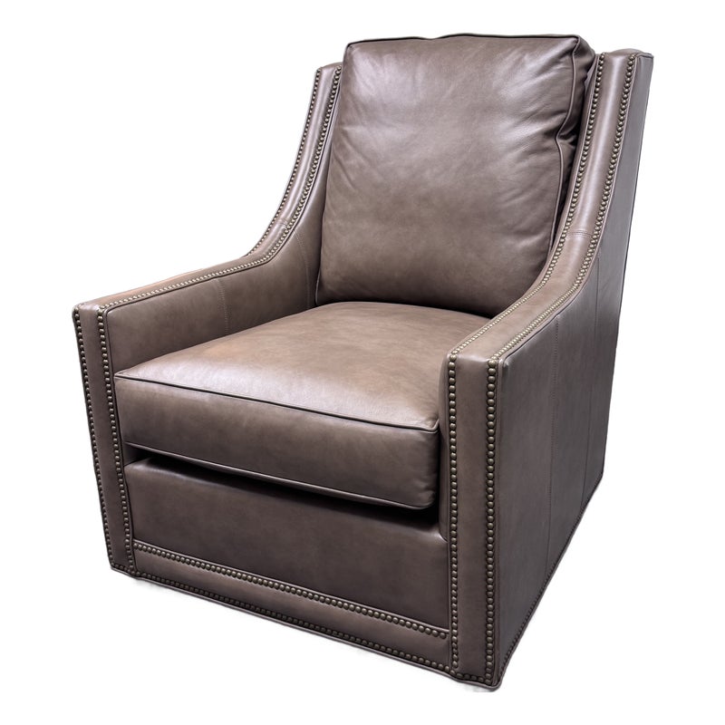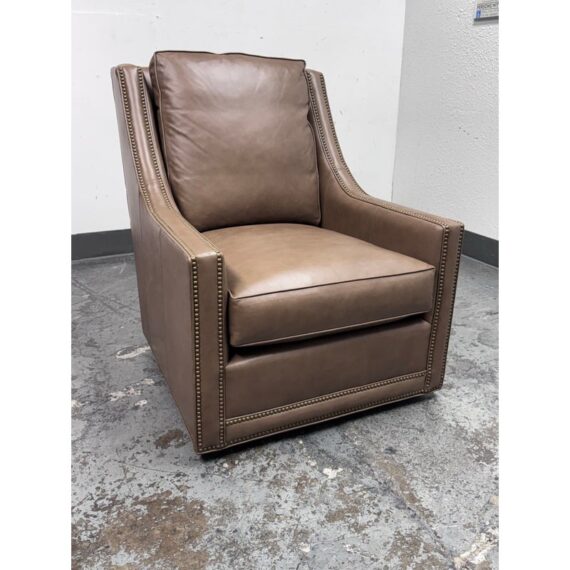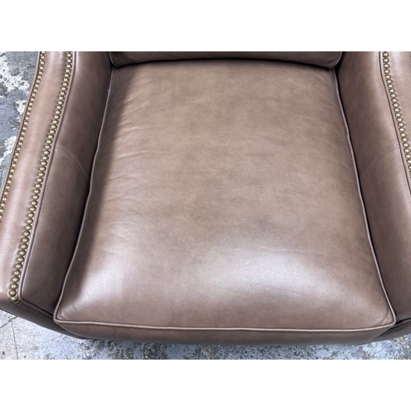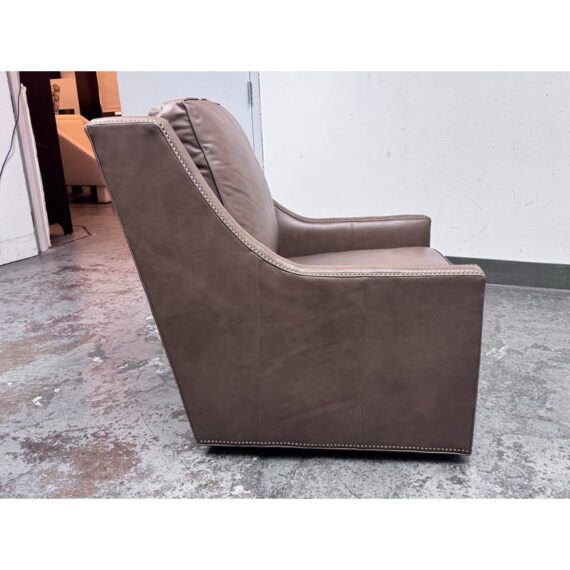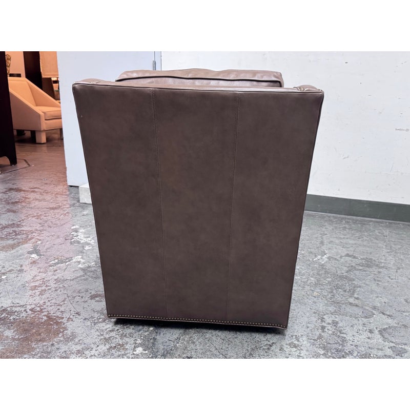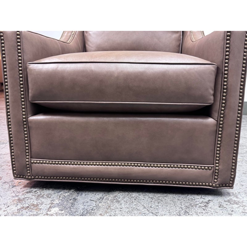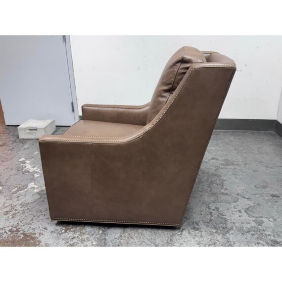 Design Plus Gallery presents a Milk Chocolate Mocha Brown Leather Swivel Chair, the Larsen by Taylor King. Loose seat and back cushions, with entirely wrapped frame that offers complimentary brass nailhead joinery at each seam for utmost protection + quality manufacturing. Find yourself enveloped in a premium and hand crafted modernized wing back chair that is in new, showroom like condition. From the San Francisco Design Center.