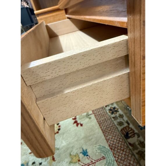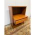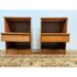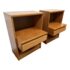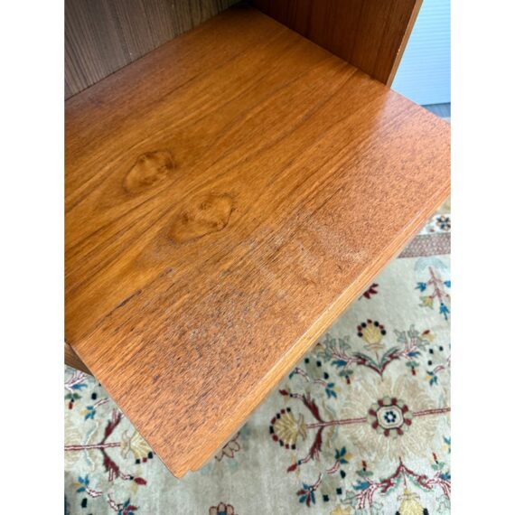 Design Pus Gallery presents a Pair of Mid 20th Century Teak Wood Nightstands. The two bedside tables have a Danish design with sculpted cabinet drawer pull and open storage above and below their shelf that slightly extends outwards. They are made from engineered wood with teak wood veneer for an easy update in your bedroom. They show visible wear that is consistent with regular usage.