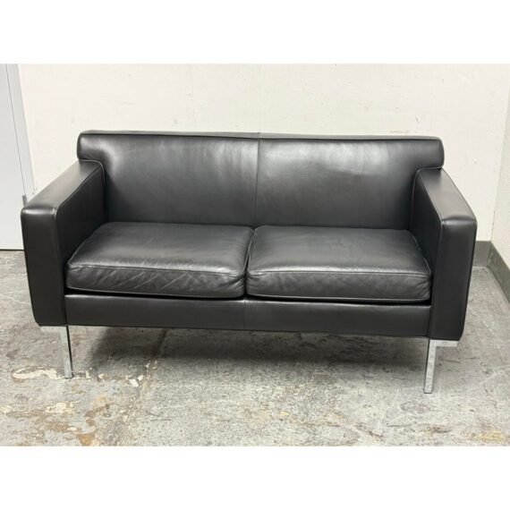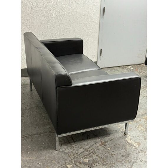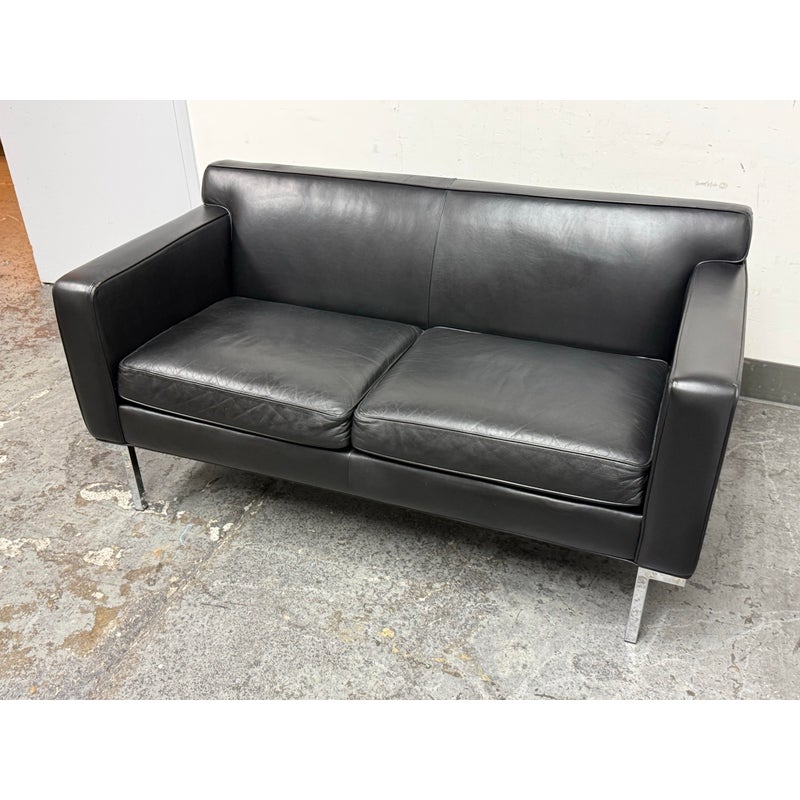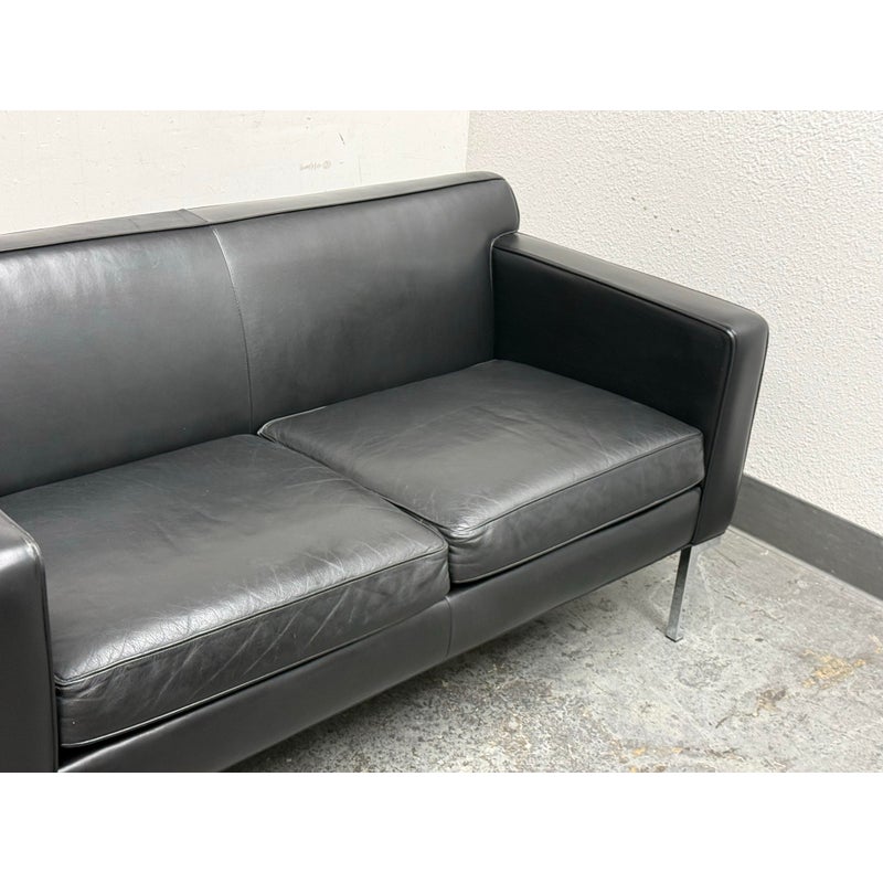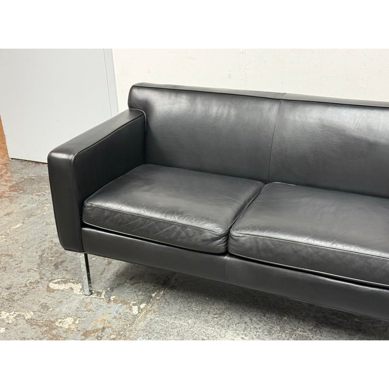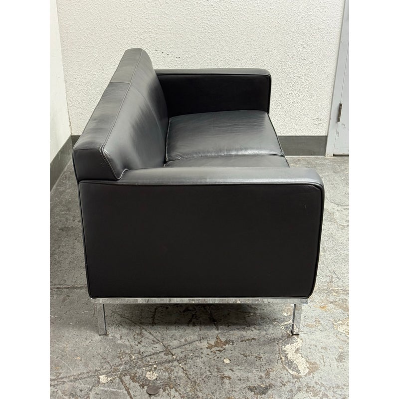 Design Plus Gallery presents the Theatre Sofa by Ted Boerner for Design Within Reach and American Leather. Designed in 2001 with studied proportions and geometric clarity, this sofa prioritizes comfort through its architectural form rather than excessive padding. A gently angled backrest, generous seat depth, and elevated armrests create supportive seating with balanced structure. The sofa is upholstered in black leather with a tailored profile and continuous chromed steel base runs the full depth of the frame. The combination of leather and steel highlights the modernist character of the piece while maintaining a timeless silhouette. It is in good condition with visible and minimal wear from usage. Made in the U.S.A.