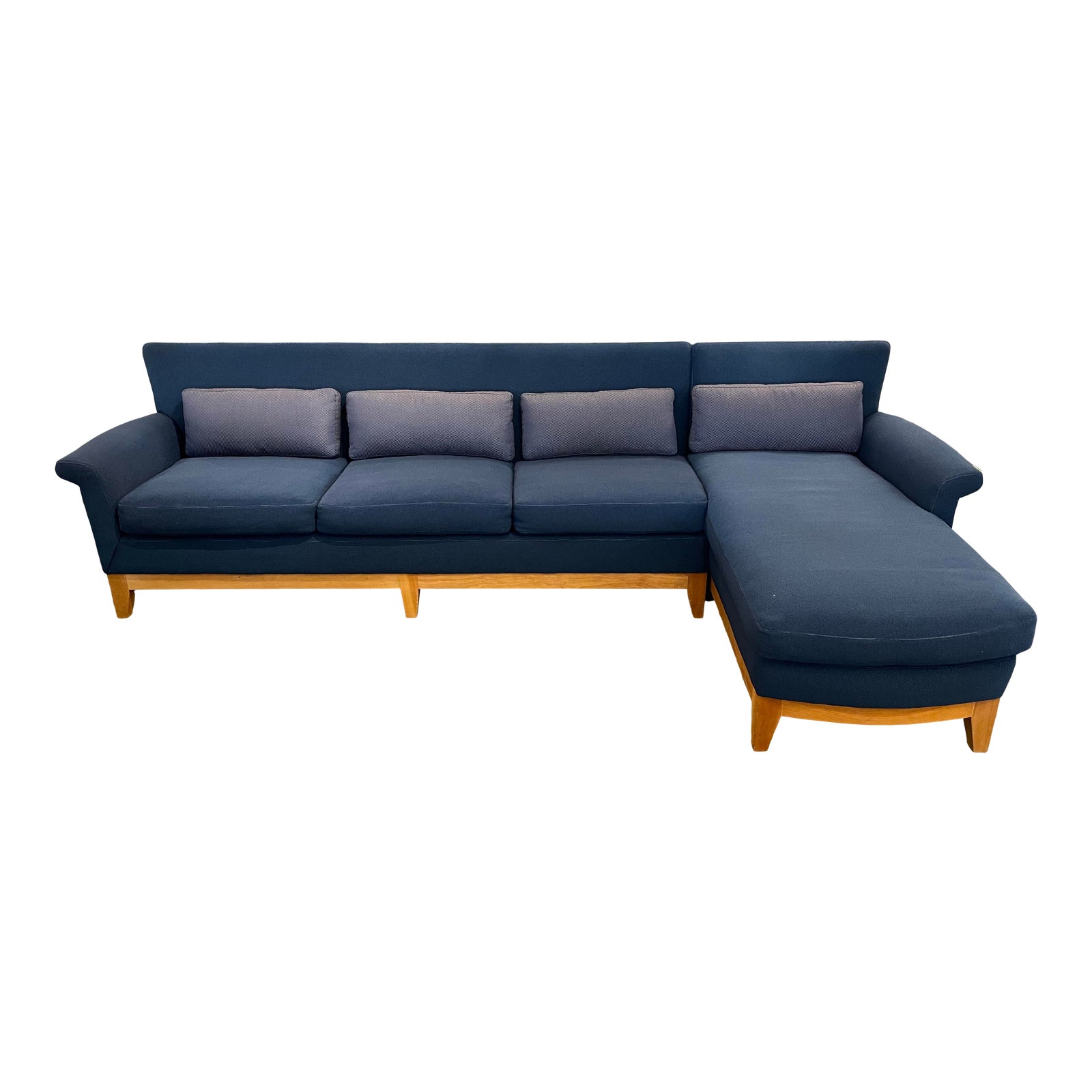 Design Plus Gallery presents the Intermezzo Sectional by Ted Boerner. Conceived and contoured to fit the body, this 2pc Sectional embodies the perfect style for both the transitional or modern setting. The curving back, chaise, coordinating lumbar cushions and slightly rolled arms guarantee form-fitting comfort. The solid wood Leg + Apron Base in Oak and rich blue upholstery brings the style. Handcrafted in California.
