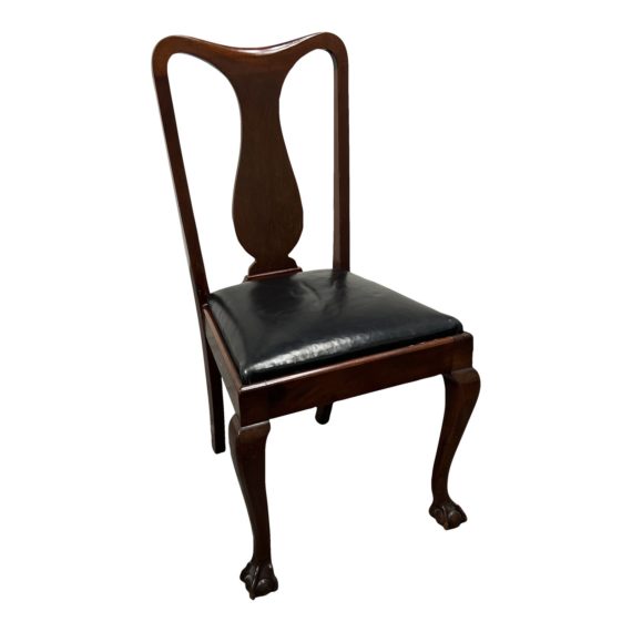 Design Plus Gallery presents a Mahogany Dining Chair in the Queen Anne Style. The chair has a momentous plague of the fact that early on in Former President Theodore Roosevelts political career this chair was used by him. Leather bound seat cushion and gorgeous mahogany wood, cabriole front legs with slightly tapered and turned out ones in back. Little plague of historical significance found on the back. Visible signs of wear that are consistent with age + use.
