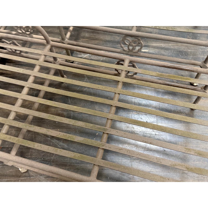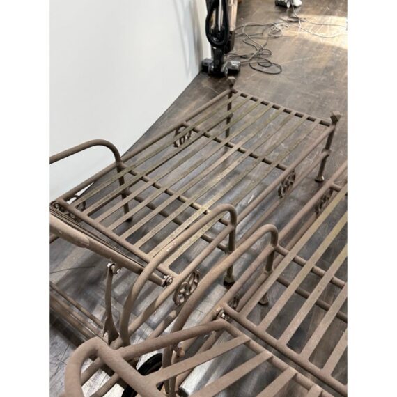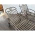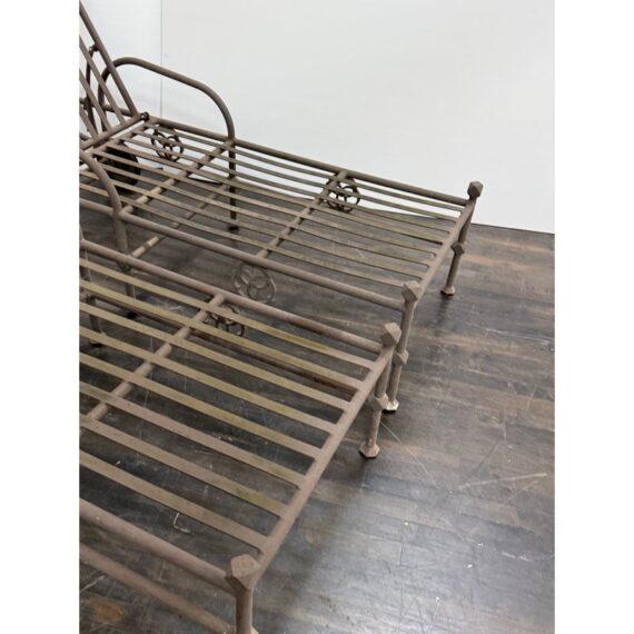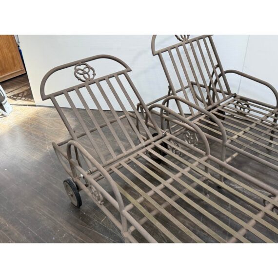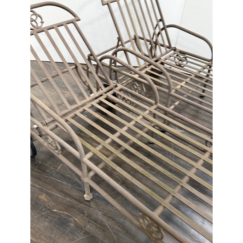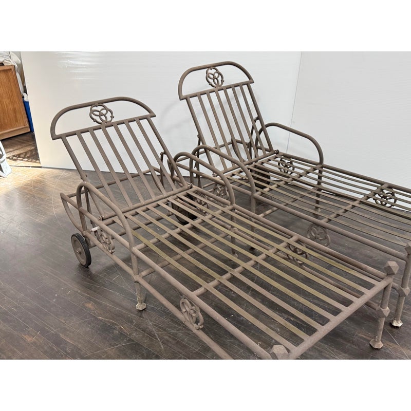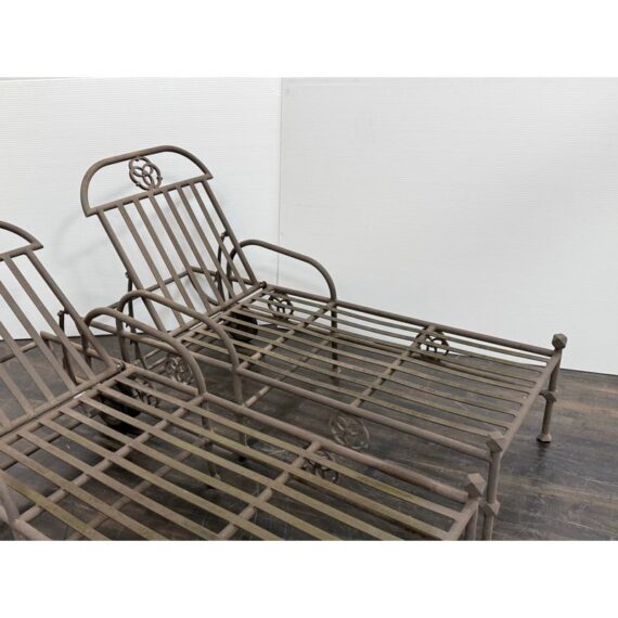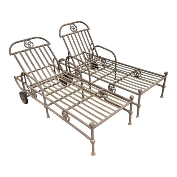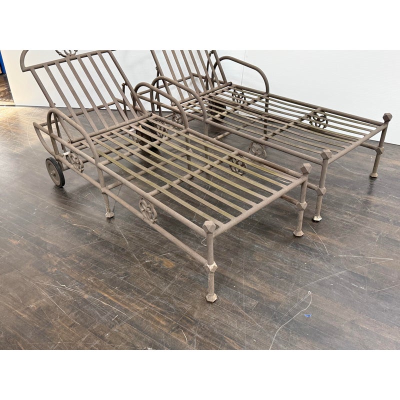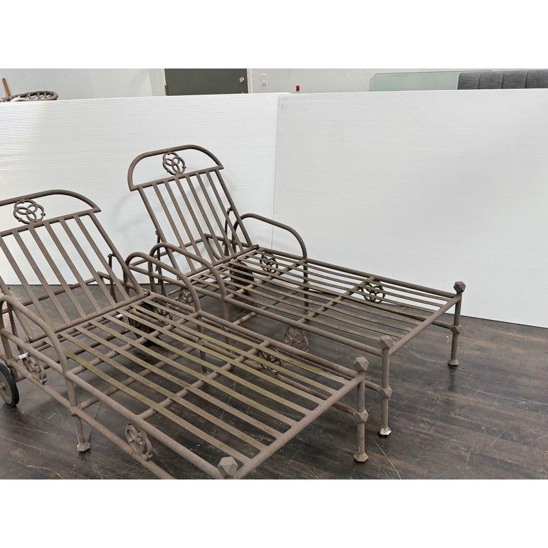 Design Plus Gallery presents a Pair of Renaissance Outdoor Chaises from Terra Furniture. The pair of chaise loungers have an adjustable back, rolling rear wheels, and an aluminum base made to withstand outdoor conditions. The openwork detailing and linear frames give them a distinctive architectural look, while the metal construction offers lasting durability. Does not come with cushions. This is a discontinued model with the brand, and they are in good condition with visible and minimal wear from usage. Made in the USA.