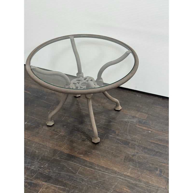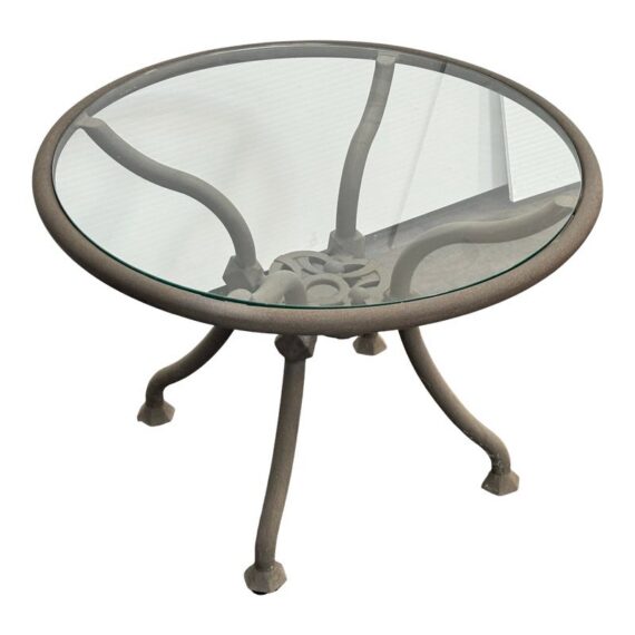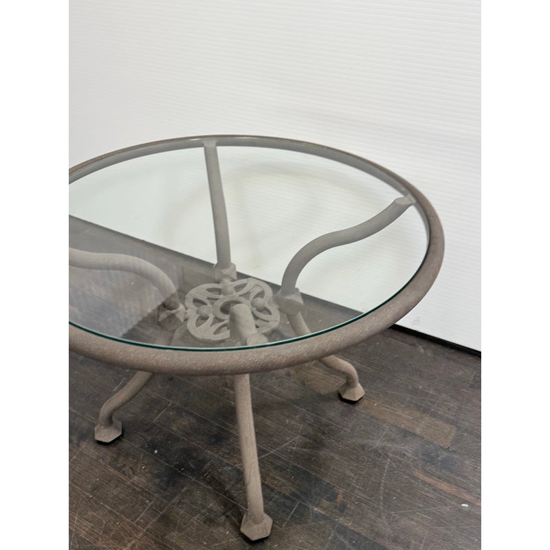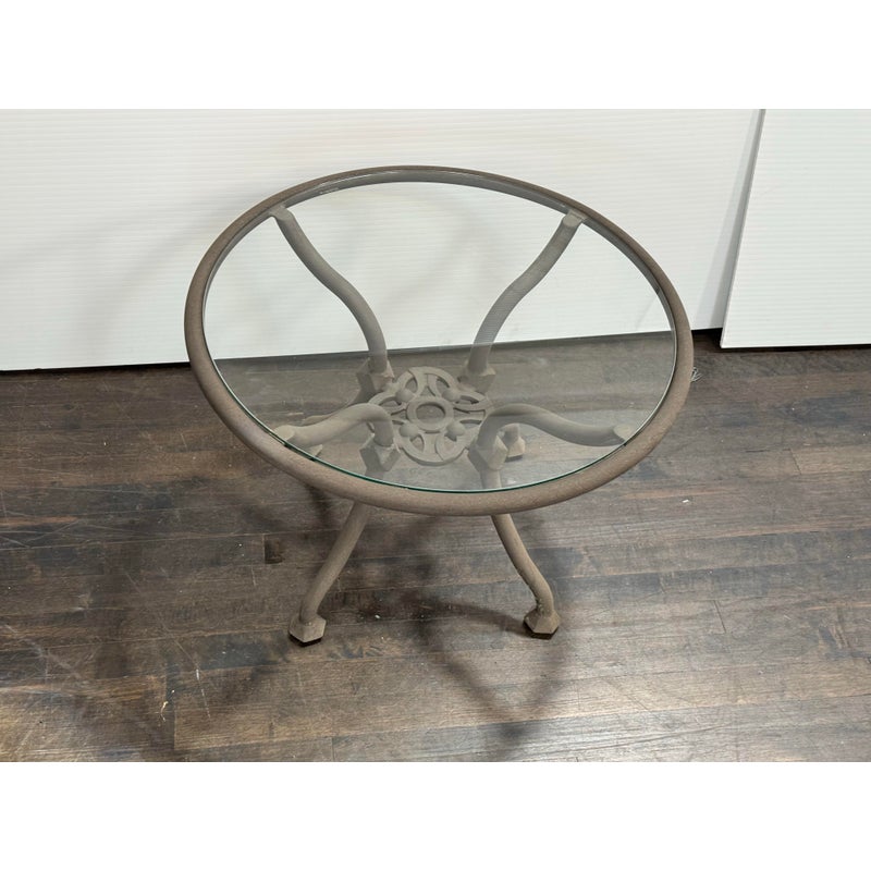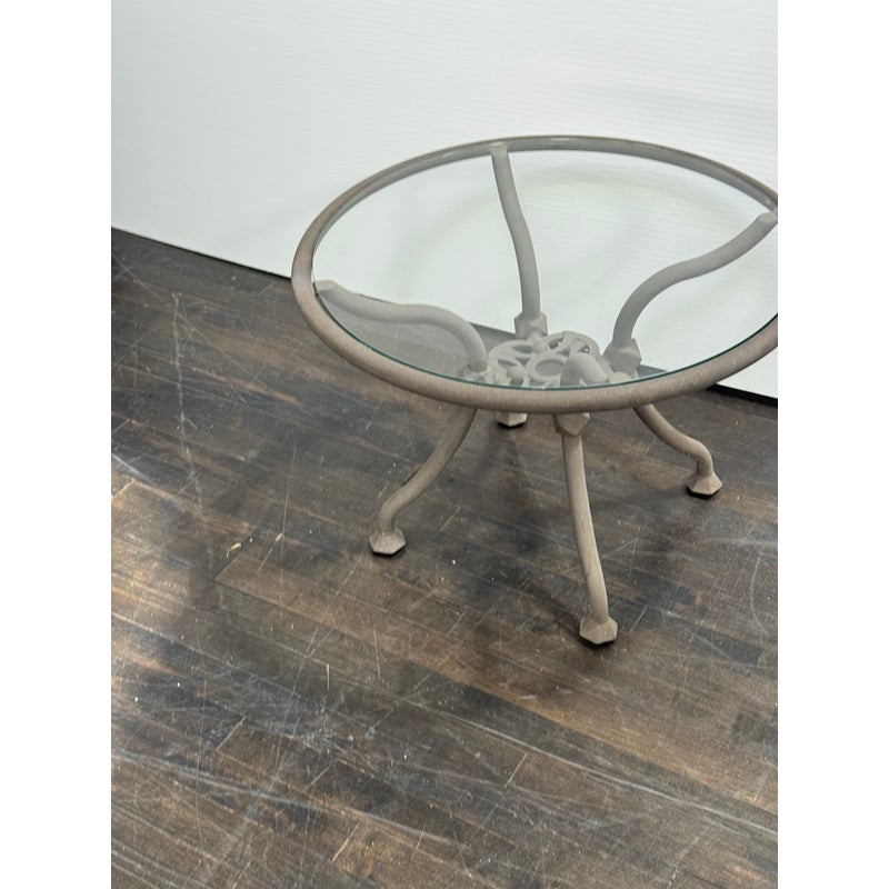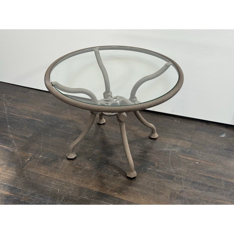 Design Plus Gallery presents a Renaissance Outdoor Side Table from Terra Furniture. The round clear glass top rests within a weather-resistant aluminum frame detailed with curved supports and an openwork center motif drawn from classical garden furniture forms. This is a discontinued model with the brand and is in good condition with visible and minimal wear from usage. Made in the USA.