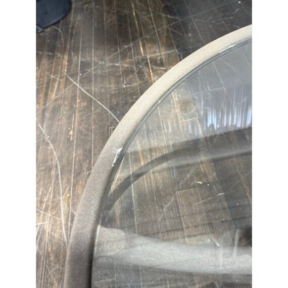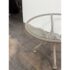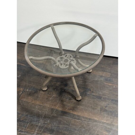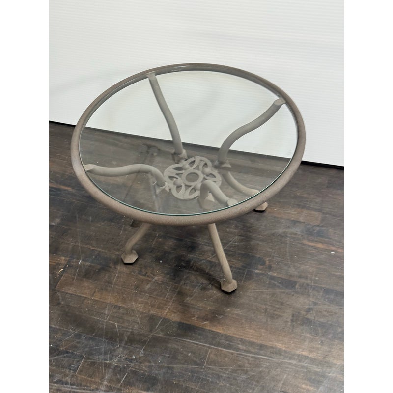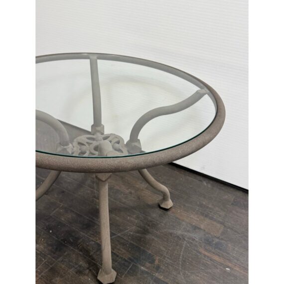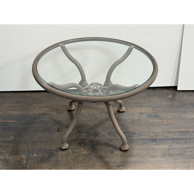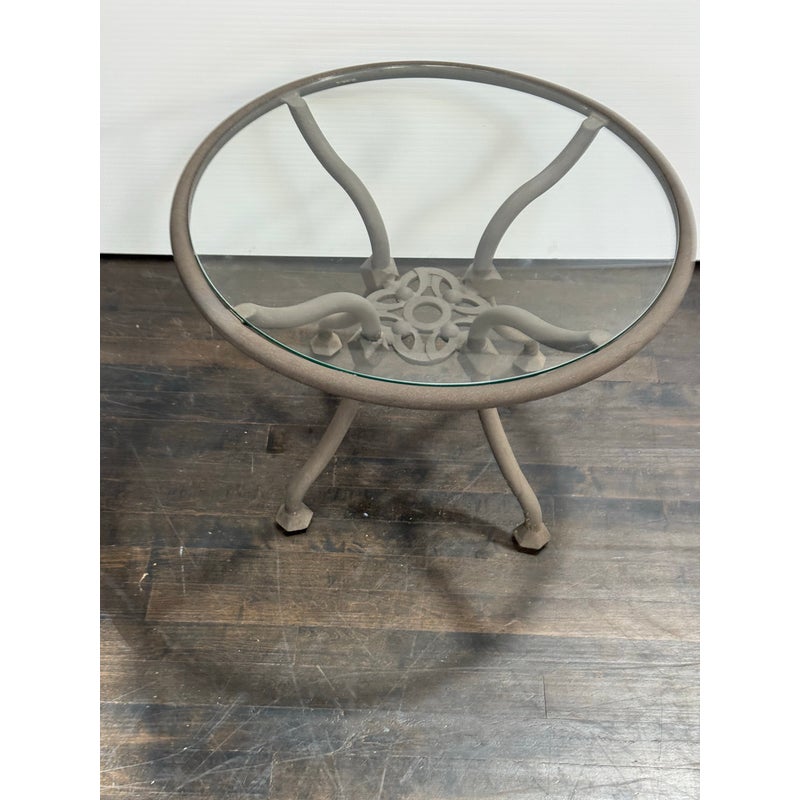 Design Plus Gallery presents a Renaissance Outdoor Side Table from Terra Furniture. The round clear glass top rests within a weather-resistant aluminum frame detailed with curved supports and an openwork center motif drawn from classical garden furniture forms. This is a discontinued model with the brand and is in good condition with visible and minimal wear from usage. Made in the USA.