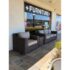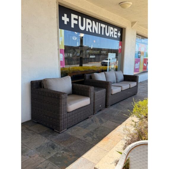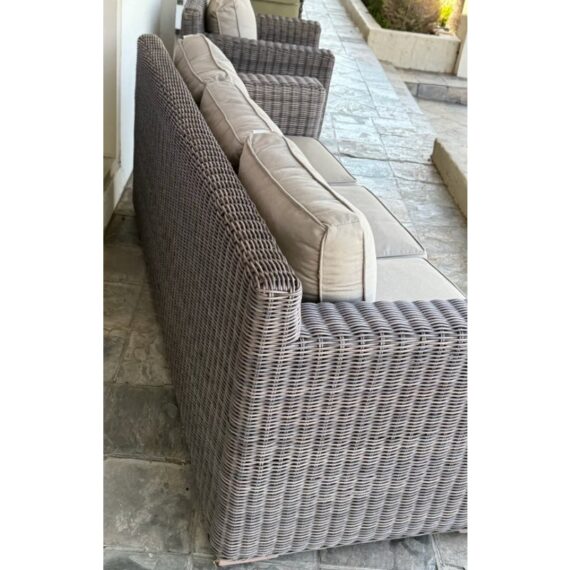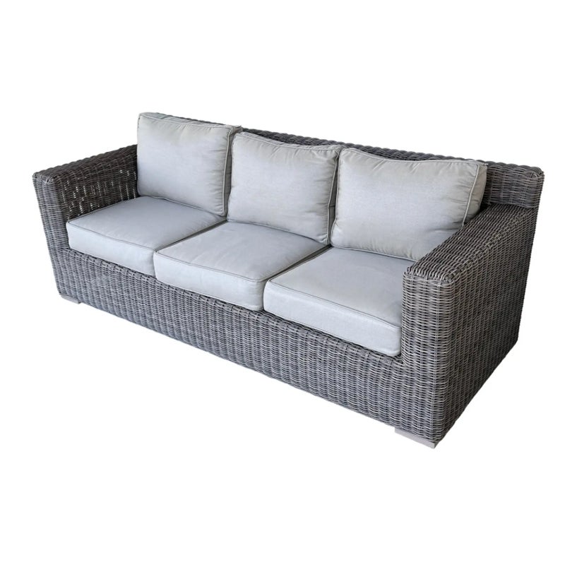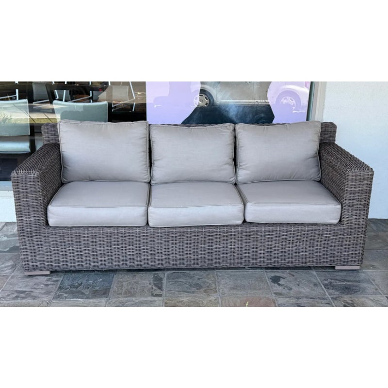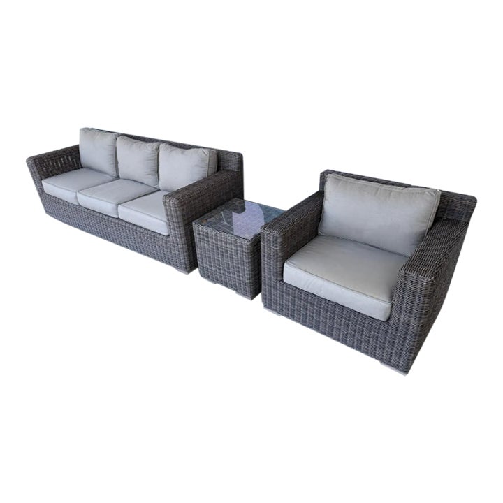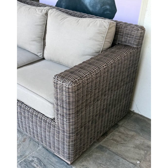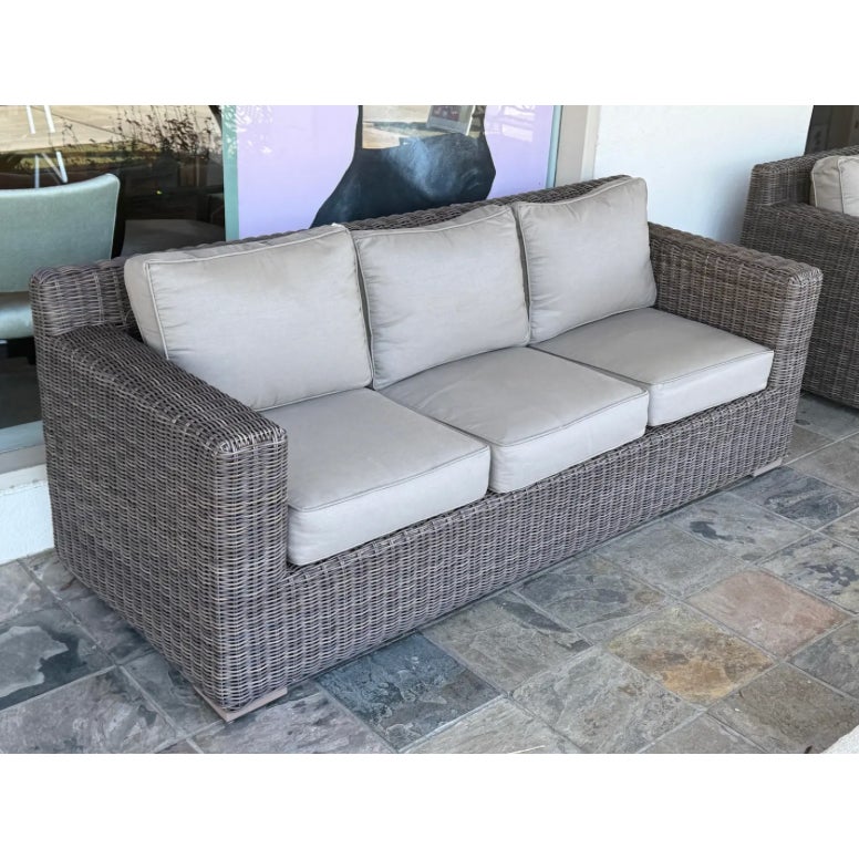 Design Plus Gallery presents a Set of Sausalito Performance Wicker Outdoor from Terra Furniture. The set offers you their Sausalito Sofa, Lounge Chair + matching glass topped side table. Their performance wicker gets a modern makeover featuring natural beauty, and a contemporary silhouette that stands up to the elements with little maintenance. Woven of all-weather textured materials that simulate real wicker. Both the sofa and lounge chair offer deep seats with wide arms.. Welted tan Sunbrella cushions that are removable for cleaning or replacement. Light surface wear; cushion covers stains; condition is consistent with age and use.