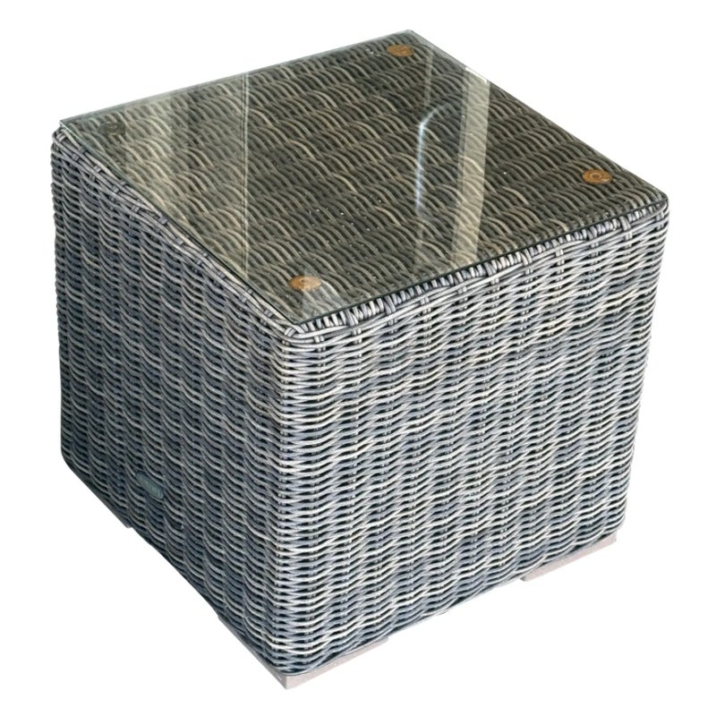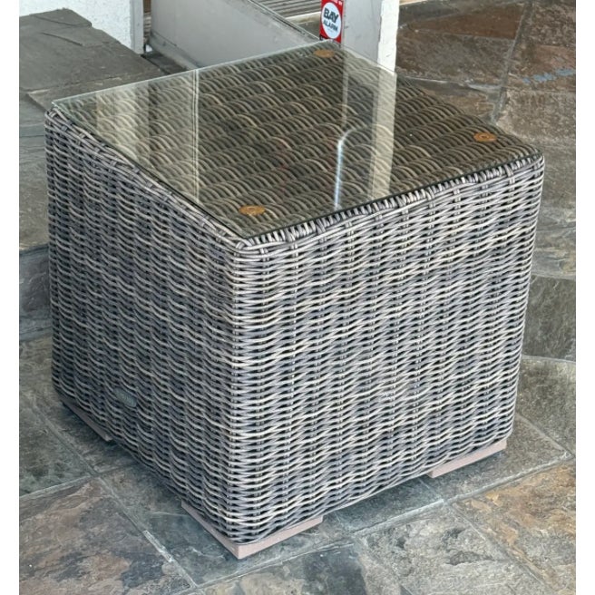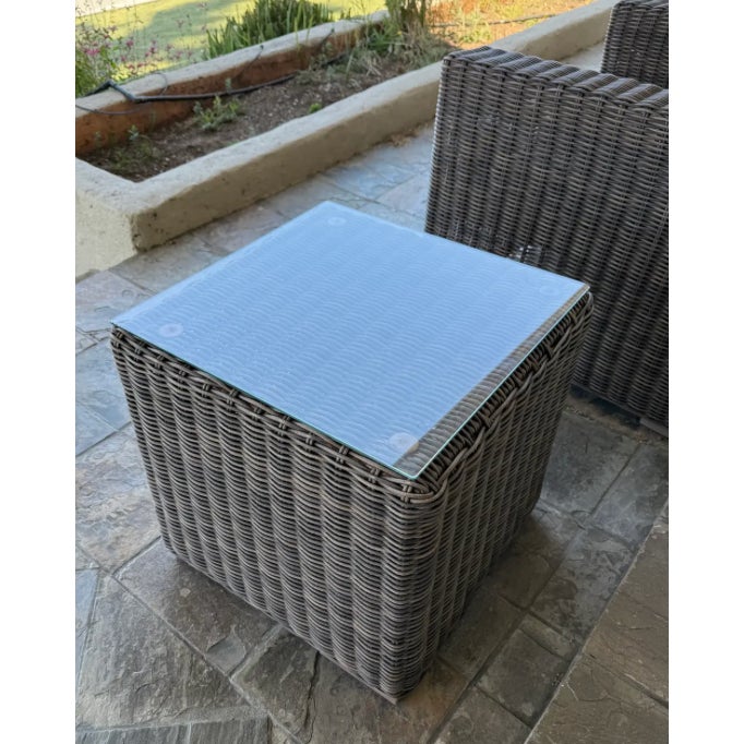 Sausalito Natural Wicker Outdoor Side Table from Terra Furniture. Wicker gets a modern makeover featuring natural beauty that stands up to the elements with little maintenance. Woven of all-weather textured and shading material simulating real rattan, the perfectly scaled table, with glass, fits wherever needed. Light surface wear; needs replacement suction pads; condition is consistent with age and use.
