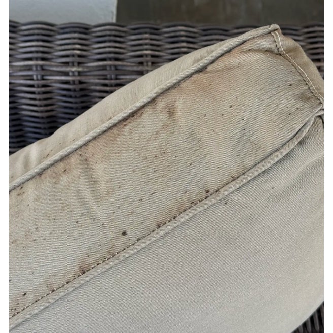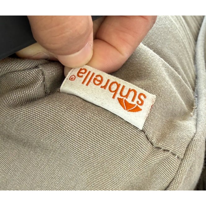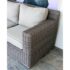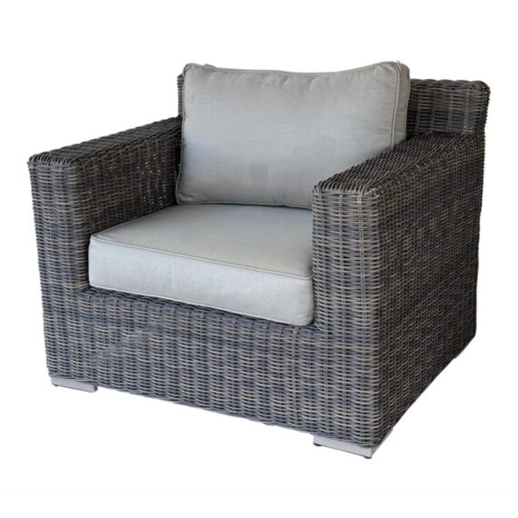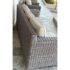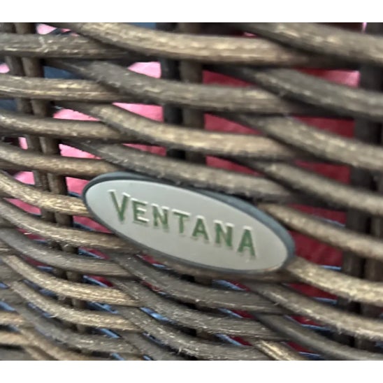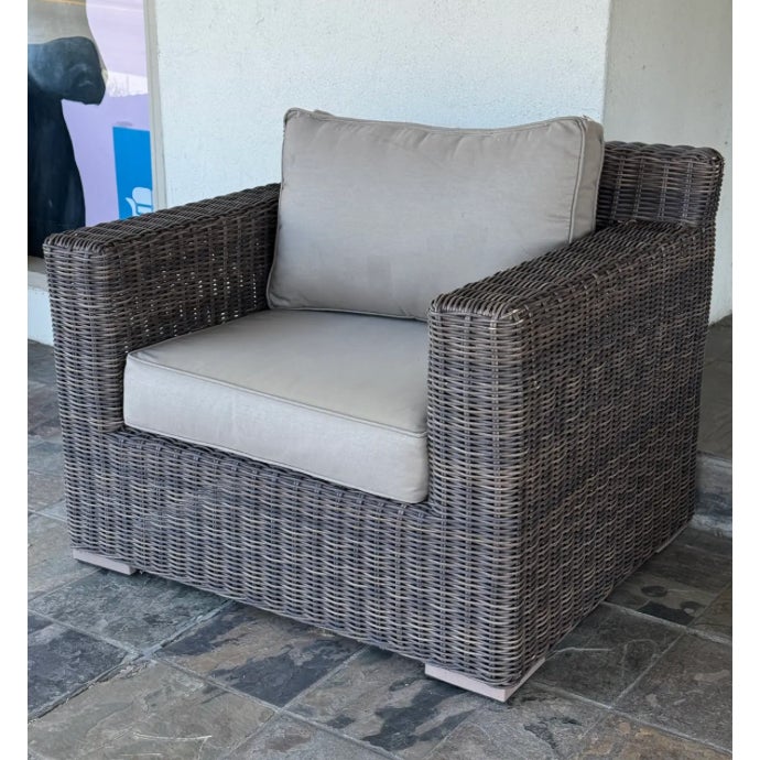 Performance Wicker Lounge Chair from Terra Furniture. Wicker gets a modern makeover featuring natural beauty, and a contemporary silhouette that stands up to the elements with little maintenance. Woven of all-weather textured and shaded materials simulating real wicker, the chair has a deep seat and wide arms for lounging. Welted tan Sunbrella cushions adds to your comfort. Light surface wear; cushion covers stains; condition is consistent with usage.