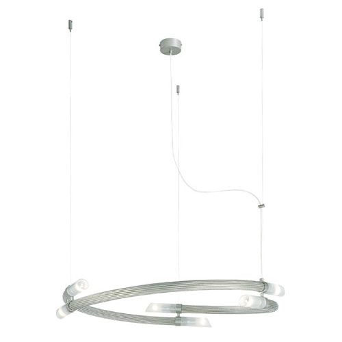 Design Plus Gallery presents a Terzani Adele 6 Light Ceiling Fixture. Terzani combines the exquisite styling of its Italy with the technology. Ribbed metal is finished in a brushed chrome and circulates in three equal pieces each starting and ending with a frosted glass shade.