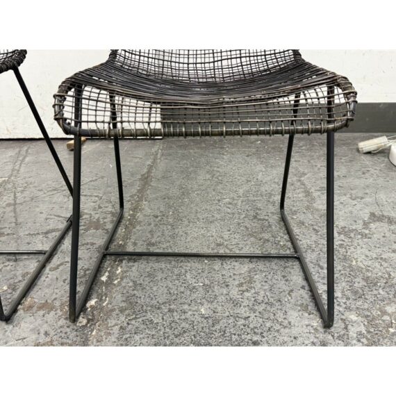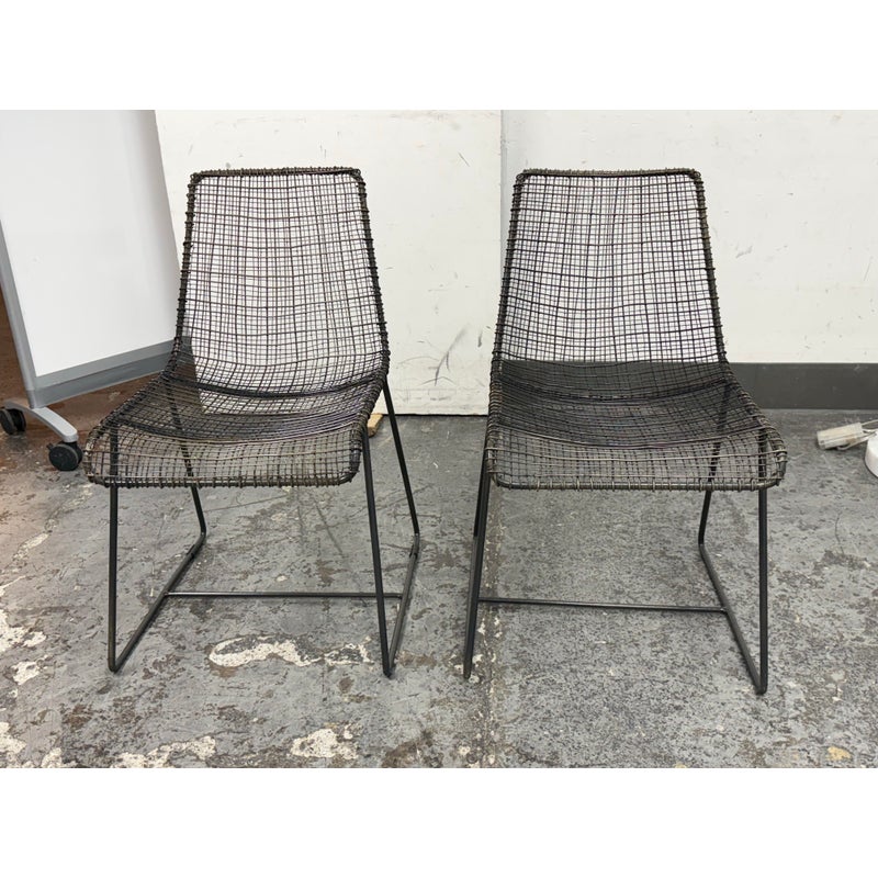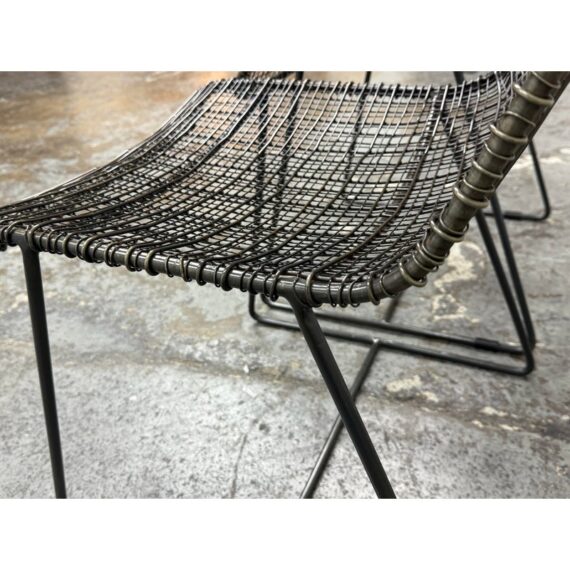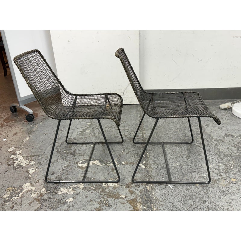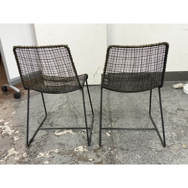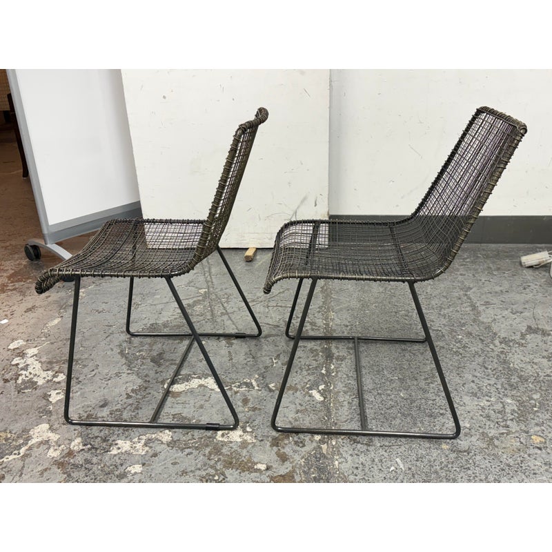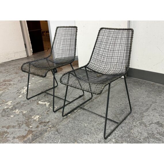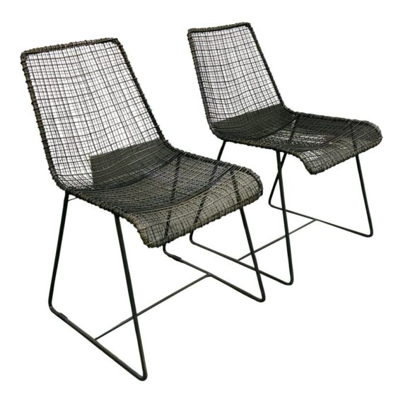Design Plus Gallery presents a Pair of Sonoma Dining Chairs from Texxture. The chairs have been hand-woven and epoxy-coated steel designed to look like natural vines create these one-of-a-kind chairs. The sturdy construction promises long-lasting durability while the decorative vines add a touch of artistry to the overall composition. Recommended for indoor use only. They are both in good condition for their usage.