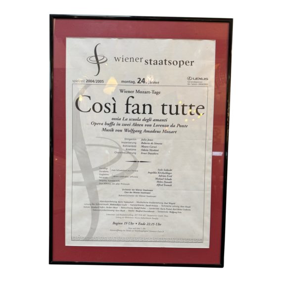 Design Plus Gallery presents a Framed Mozart Opera Framed Poster. “That’s What Everyone Does” or School of Lovers Poster, c. 2004-2005 Germany. Matted and framed to great effect, a memory for certain. Light surface wear; condition is consistent with age and use.