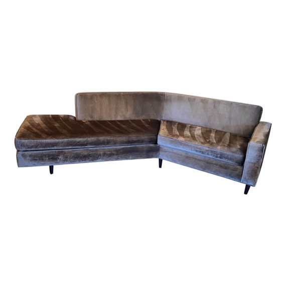 Design Plus Gallery presents the Angle Bumper Sofa by Thayer Coggin. A slightly angled connection creates this lengthy, comfortable sectional. The sections feature a tight back, foam seat cushions with self welt accents, and tapered wood legs. Upholstered in a lush brown velvet-like brown fabric. Light evidence of surface wear; consistent with age and use.