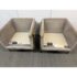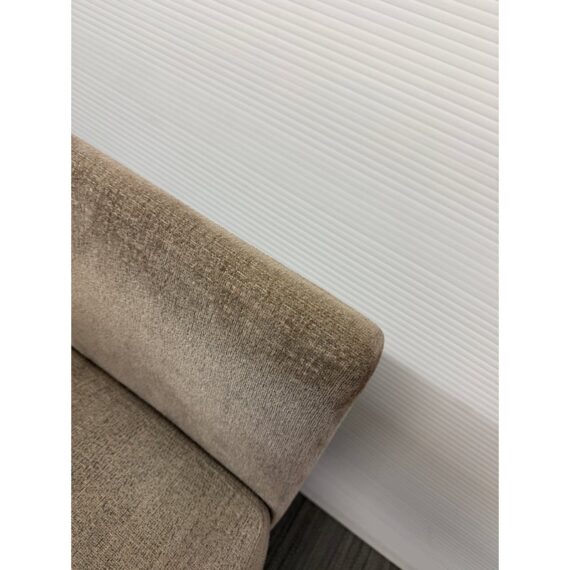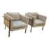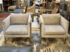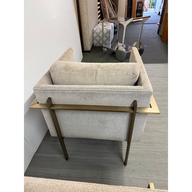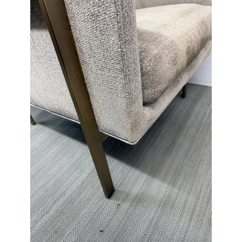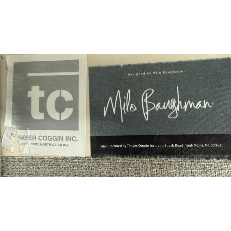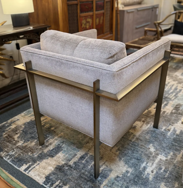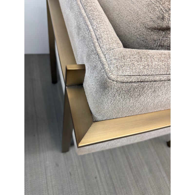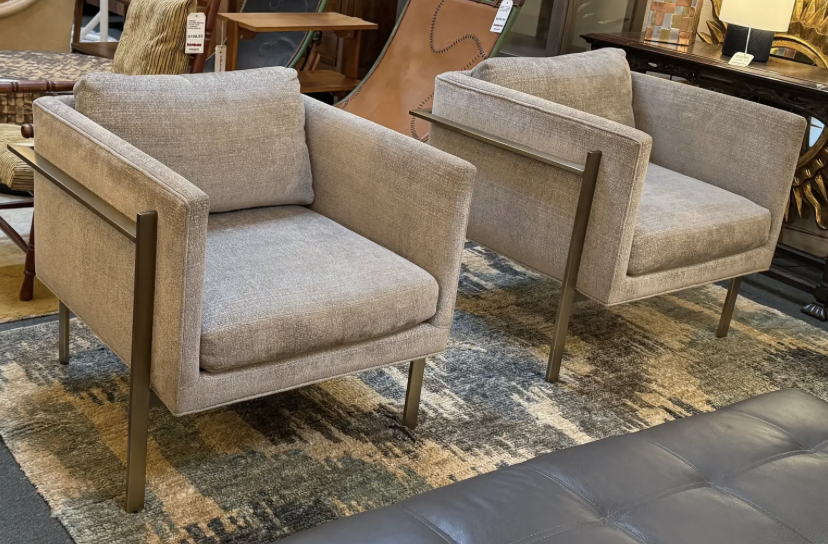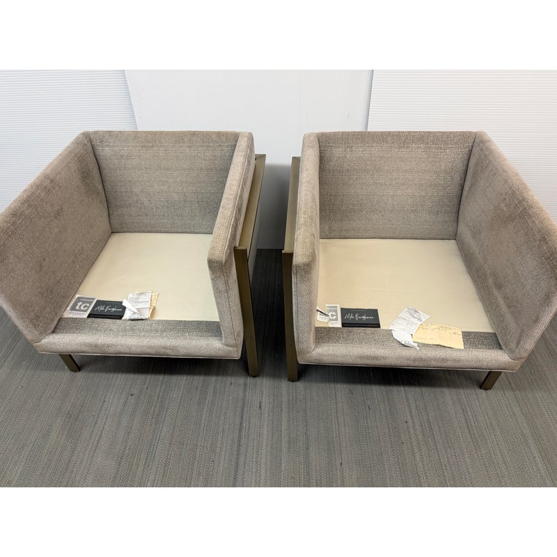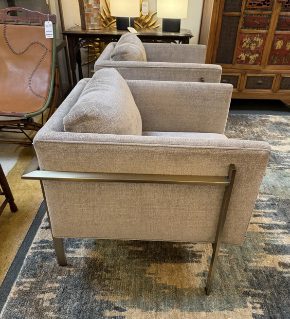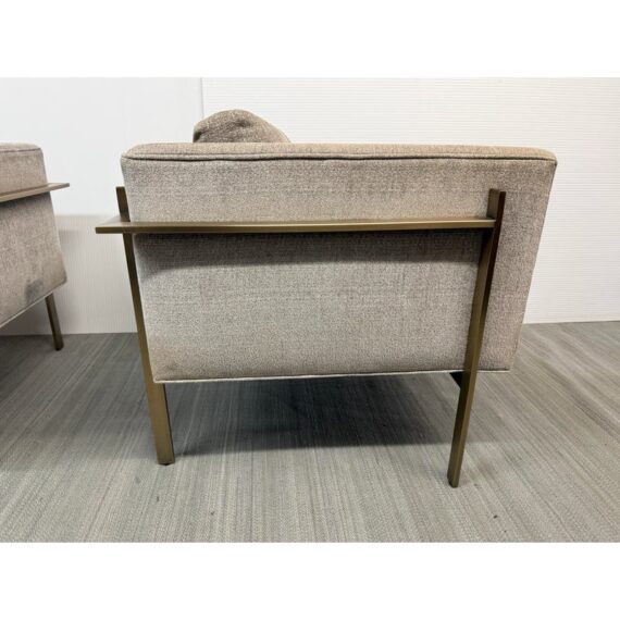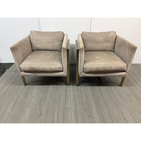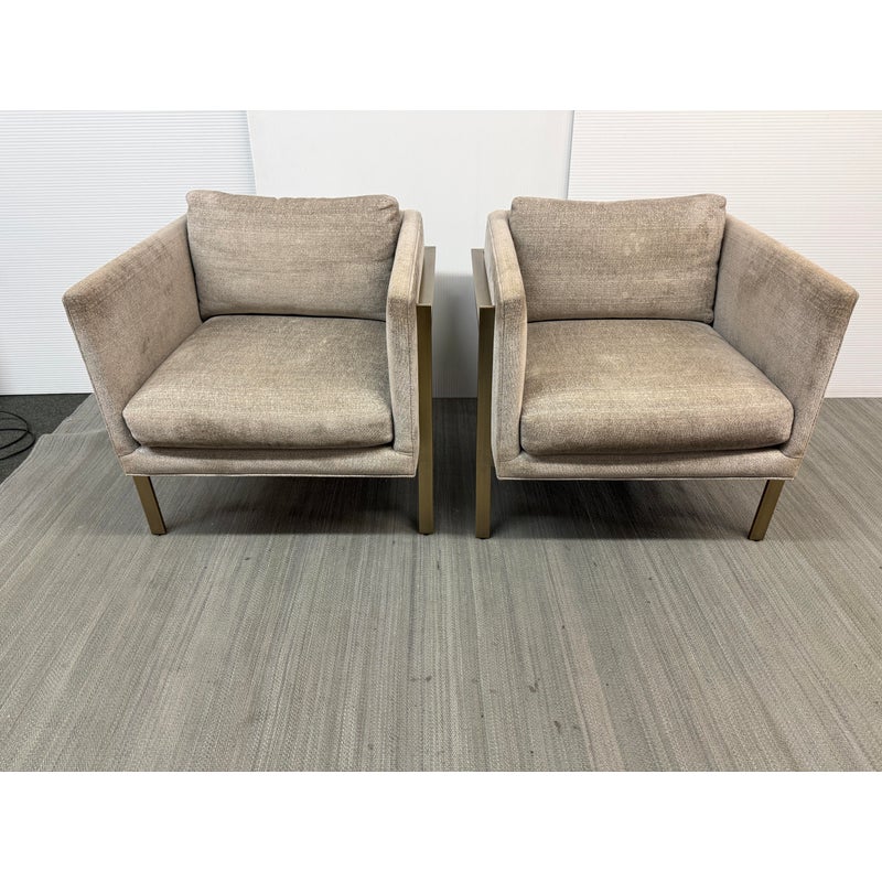 Design Plus Gallery presents a Pair of Drop In Lounge Chairs designed by Milo Baughman for Thayer Coggin. A modern classic with unmistakable sophistication, the pair are an exquisite seating solution for any space. The architectural brushed brass frame combined with a plush, lush woven pale taupe upholstery each chair provides a timeless aesthetic. Style is perfect for elegant entertaining and high-end lounging. Light soil; condition is consistent with age and use. Crafted by artisans in the USA.