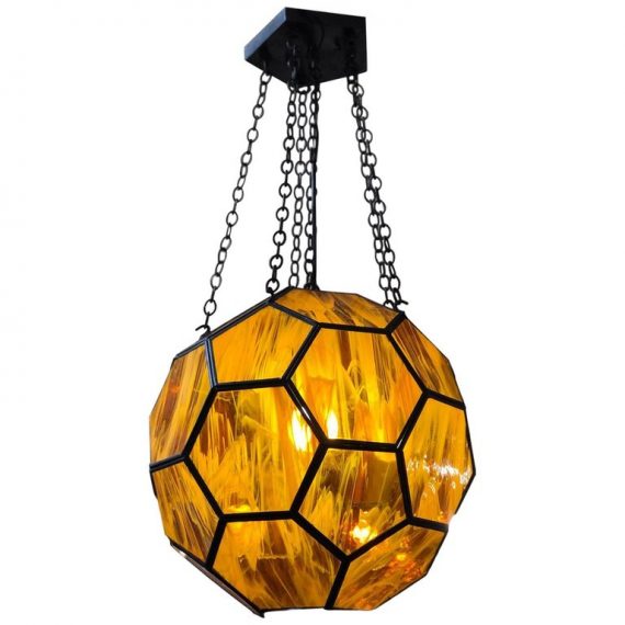 Design Plus Gallery presents the Honeycomb Pendant by Marjorie Skouros Design. Radiant Cathedral glass is inset in a black hand-painted finish pewter frame for an intense glow in every direction. Uniquely stunning.
